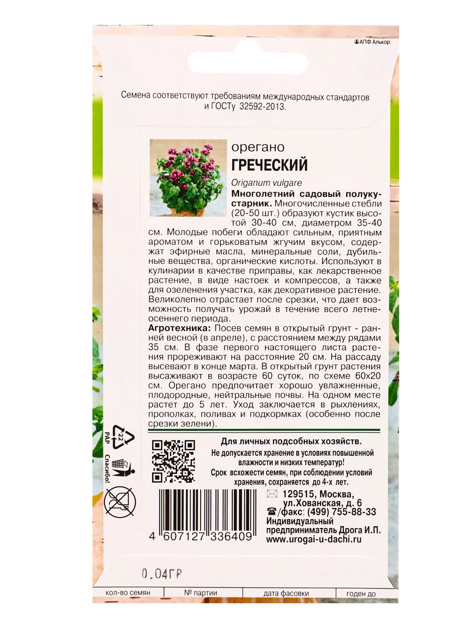 Семена Орегано Греческий 0.04 гр, УРОЖАЙ УДАЧИ, Россия