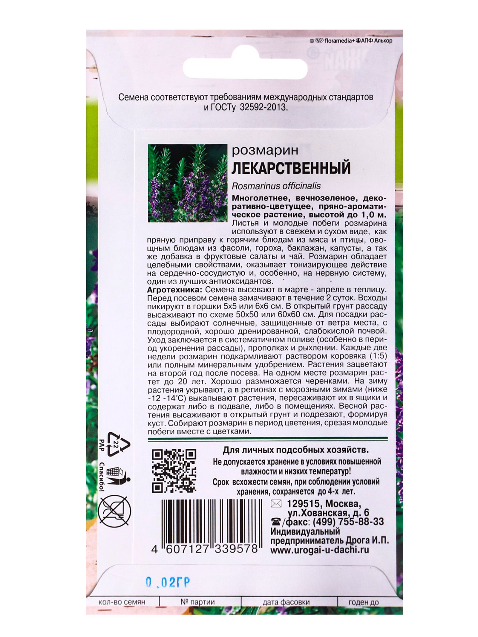 Посев на рассаду: Апрель, Март Размер упаковки: 8 x 0.1 x 15 см. Место выращивания: Открытый грунт Сроки созревания: Ранний Вид: Розмарин tnved: 1209999900 tnved: 1209999900 Применение: Пряная (в чай, к блюдам) Посев (посадка) в грунт: Май Можно выращивать на подоконнике: Да Температурное ограничение: Нет Многолетнее, вечнозеленое, декоративно-цветущее, пряно-ароматическое растение, высотой до 1,0 м. Листья и молодые побеги розмарина используют в свежем и сухом виде, как пряную приправу к горячим блюдам из мяса и птицы, овощным блюдам из фасоли, гороха, баклажан, капусты, а так же добавка в фруктовые салаты и чай. Розмарин обладает целебными свойствами, оказывает тонизирующее действие на сердечно-сосудистую и, особенно, на нервную систему, один из лучших антиоксидантов. | ||