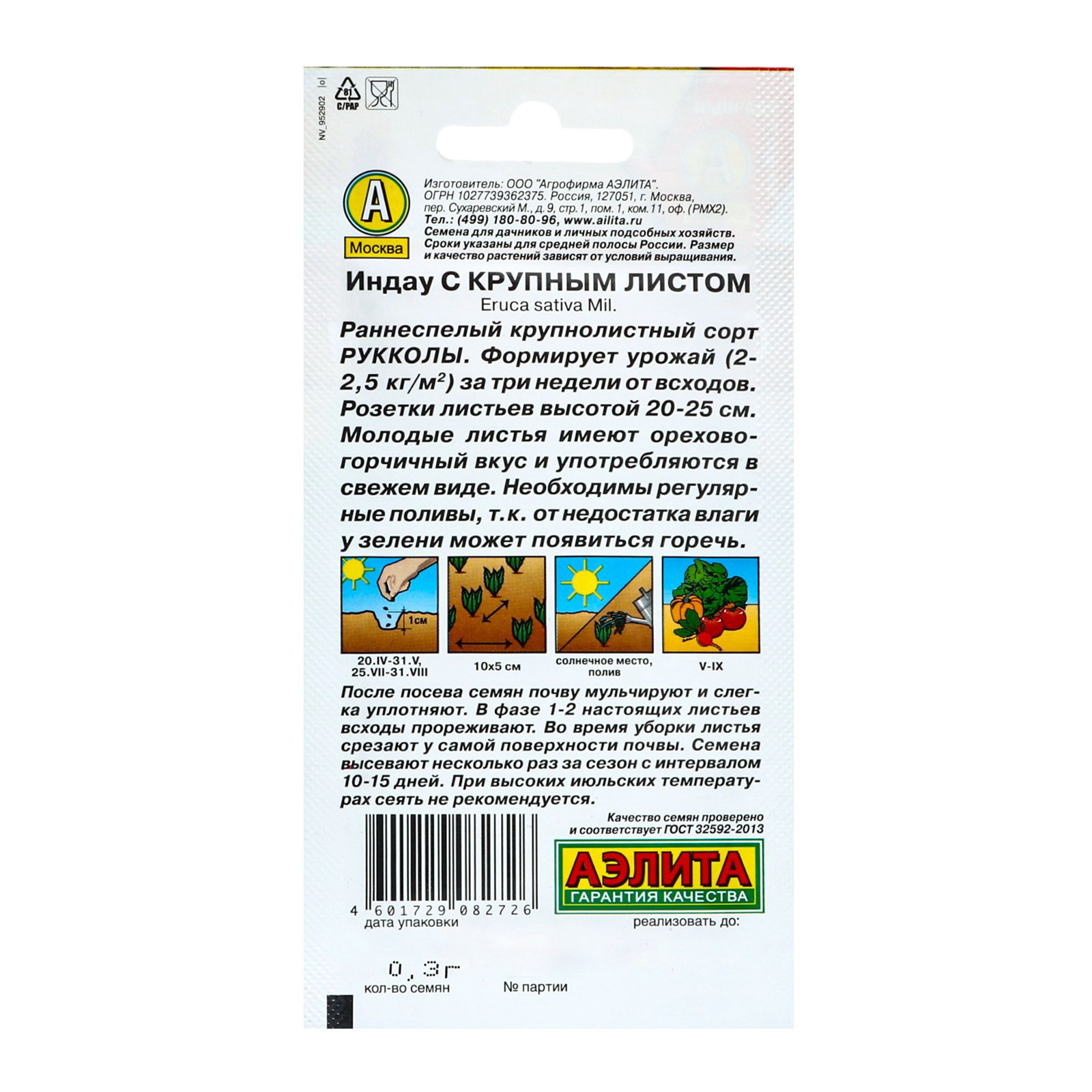 Размер упаковки: 8 x 0.1 x 15 см. Особенности выращивания: Открытый грунт Сроки созревания: Средний Вид: Руккола Вид: Руккола tnved: 1209999900 Температурное ограничение: Нет Агрономический срок годности, лет: 3 "Руккола – неприхотливая салатная культура, отличается быстрым ростом, позволяет получить урожай свежей и полезной зелени уже через 20-25 дней после появления первых всходов. Предназначена для выращивания в открытом грунте, под пленочными укрытиями, в качестве горшечной культуры на подоконнике. Молодые листья рукколы употребляют в свежем виде и добавляют в различные блюда. Пикантный освежающий вкус рукколы прекрасно сочетается с другими травами, рыбой, мясом и морепродуктами. Листья содержат много витаминов и микроэлементов. Употребление в пищу рукколы способствует выведению холестерина, стимулирует обмен веществ в организме, улучшает работу желудочно-кишечного тракта. Ешьте рукколу и будьте здоровы! Посев в открытый грунт в конце апреля на глубину 1-1,5 см Всходы при необходимости прореживают с расстоянием между растениями 8-10 см Для получения зелени в непрерывном режиме проводят повторные посевы с интервалом 2 недели до конца августа. Руккола подходит для круглогодичного выращивания дома на подоконнике." | ||