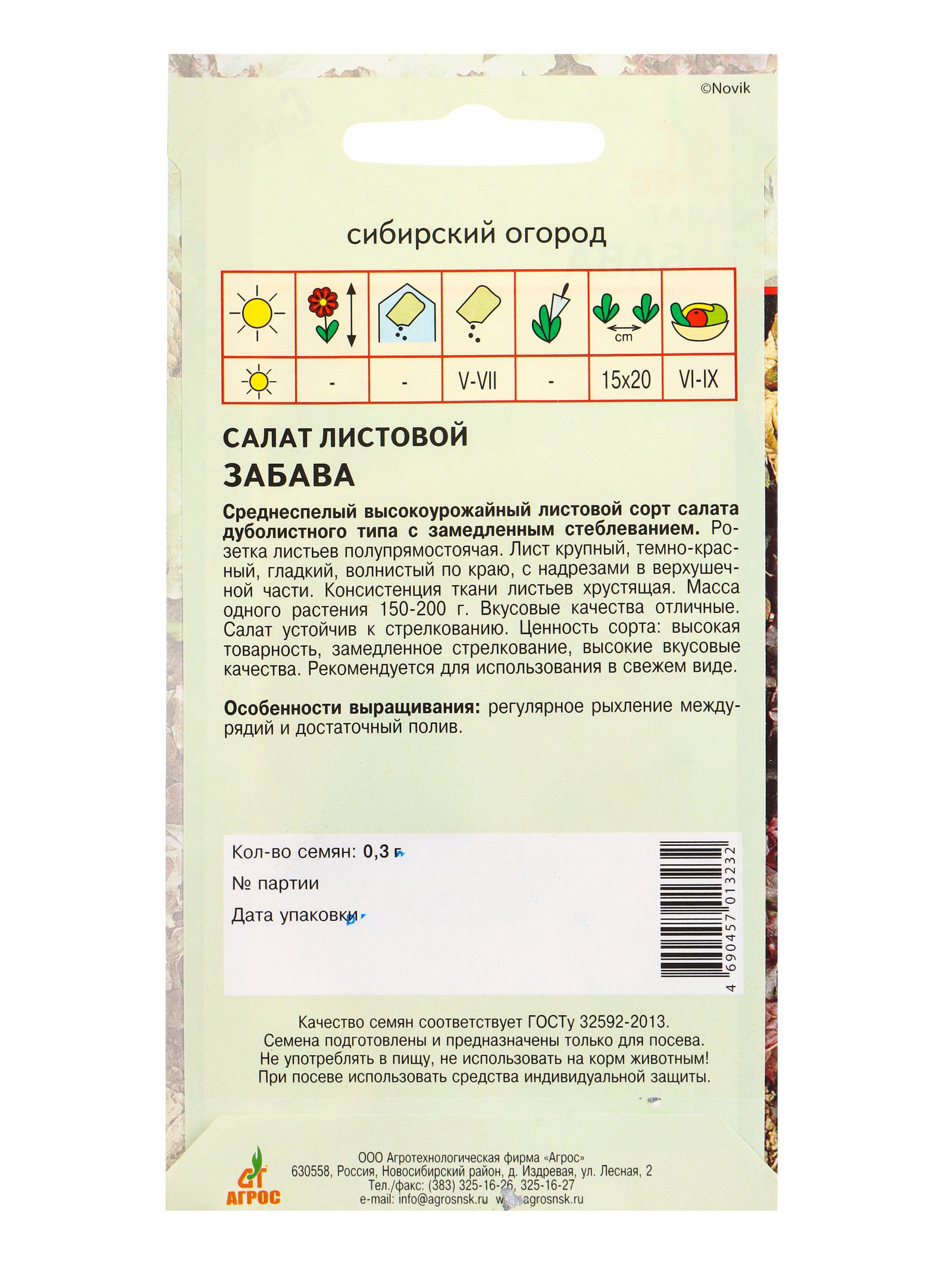 Семена Салат "Забава" 0.3 г, Агросс, Россия
