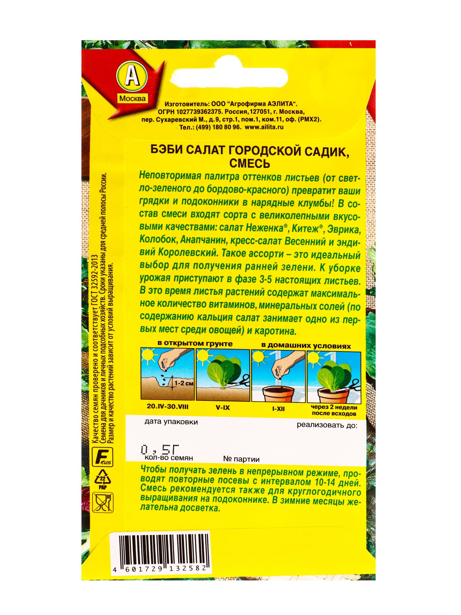 Семена Бэби салат Городской садик, смесь, Ц/П,0.5 г, Агрофирма АЭЛИТА, Россия