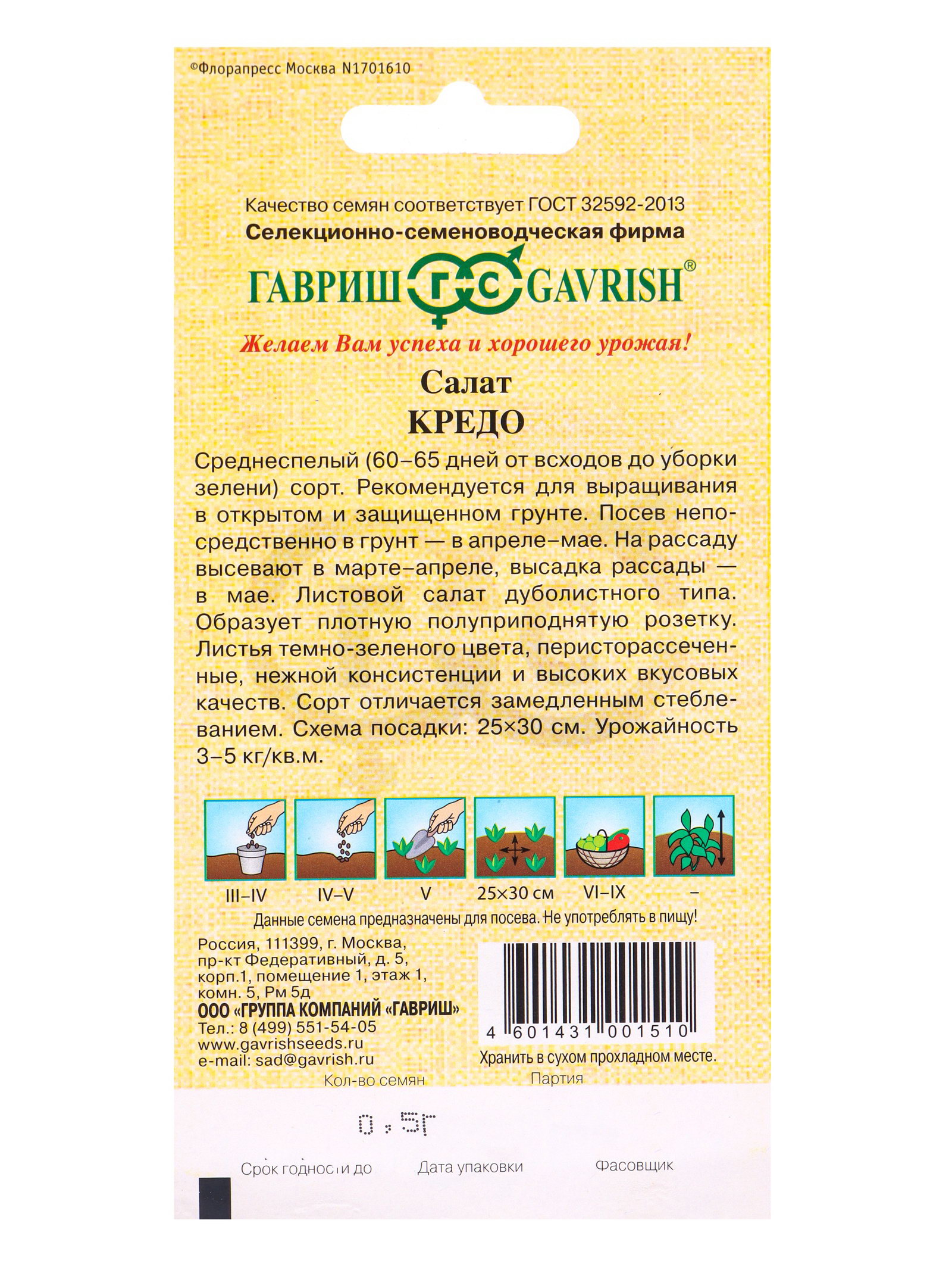 Семена Салат Кредо 0.5 г листовой,темно-зеленый автор., Гавриш, Россия