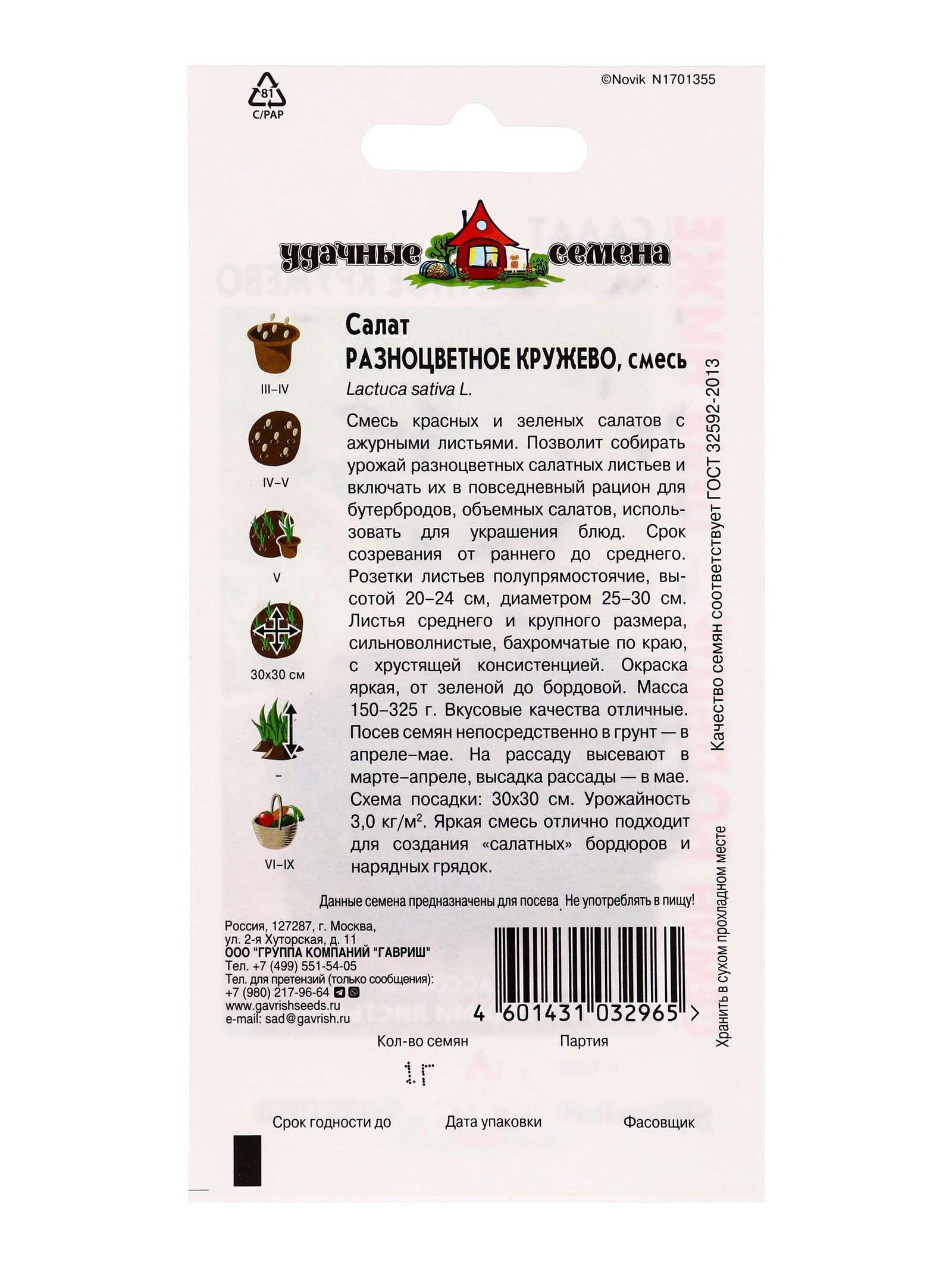 Семена Салат Разноцветное кружево 1.0 г смесь Уд. с. Семян больше, Гавриш, Россия