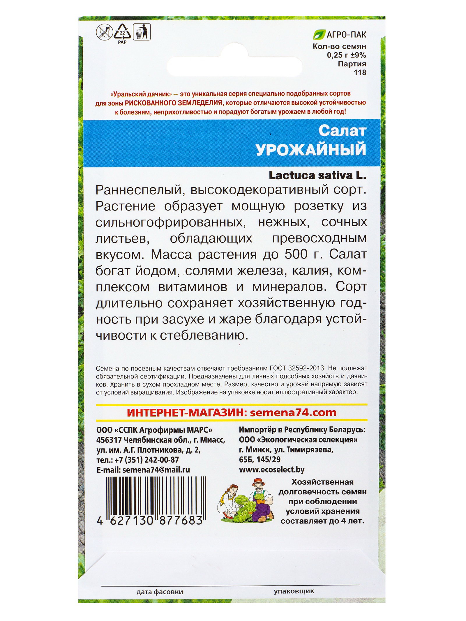 Семена Салат Урожайный, Уральский Дачник, Россия