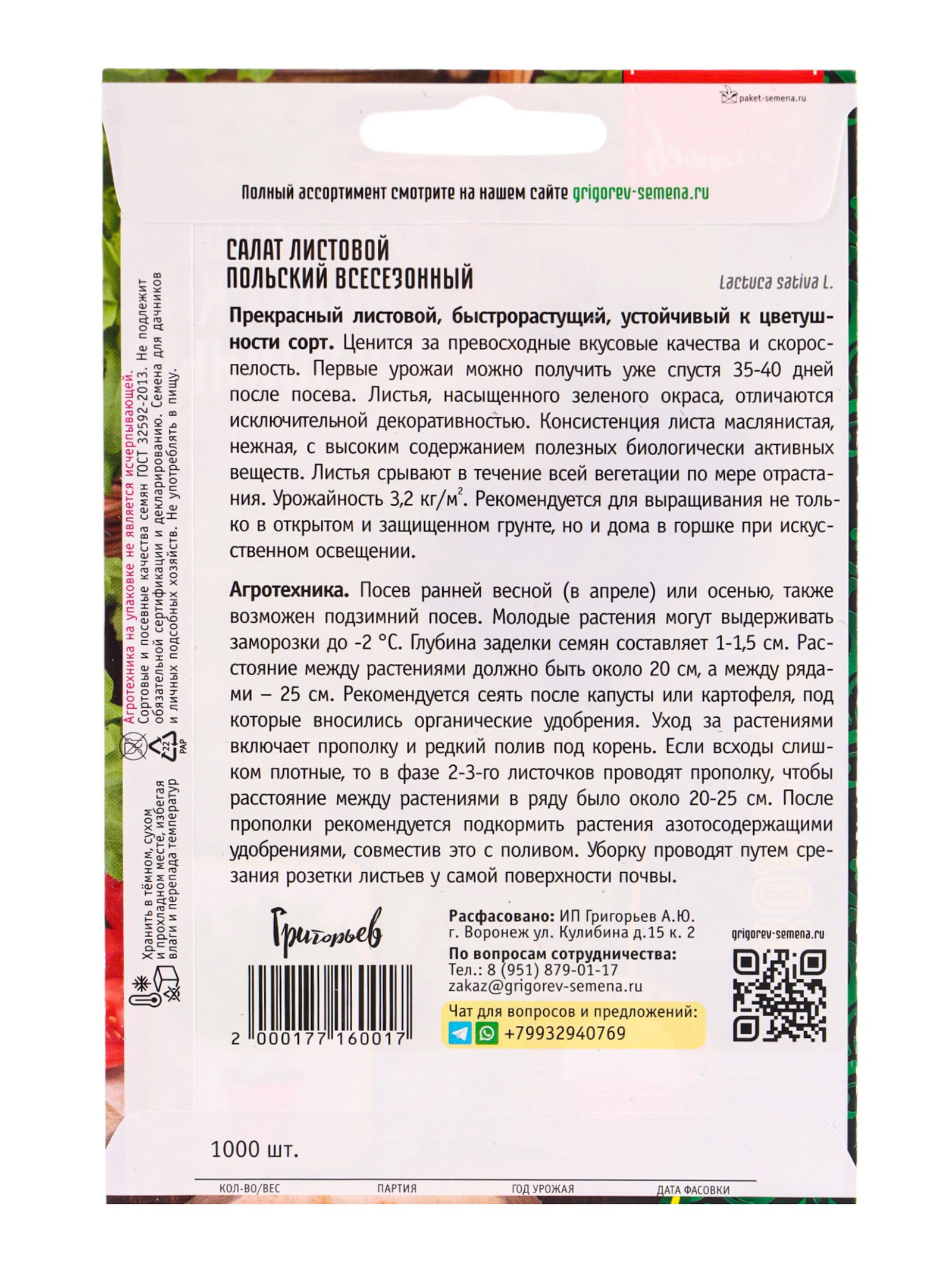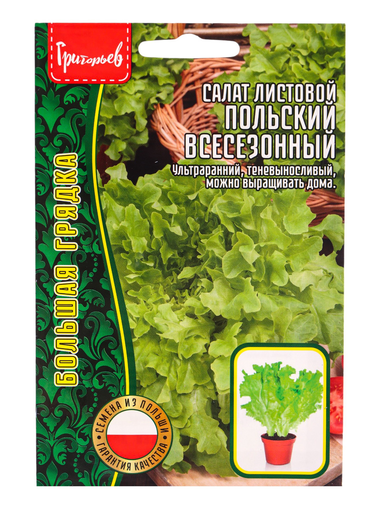 Семена Салат Польский Всесезонный листовой 1000 шт. 12.29 гр, Григорьев, Россия