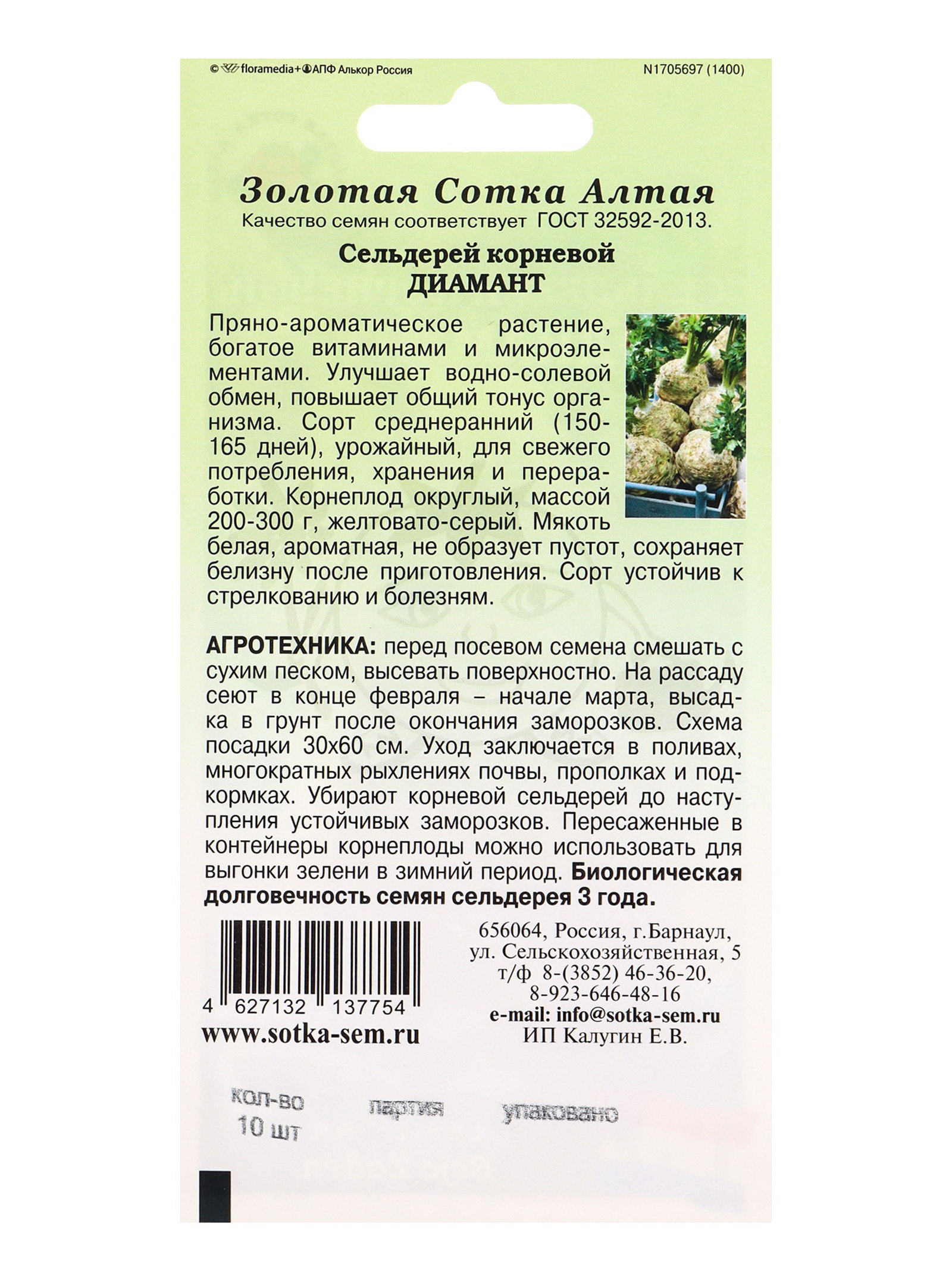 Семена Сельдерей корневой "Диамант", 10 шт., селекция Bejo Zaden, Золотая Сотка Алтая, Россия