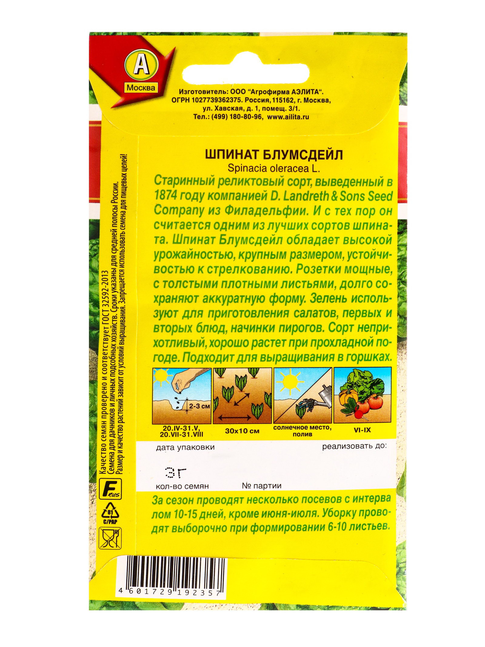 Семена Шпинат Блумсдейл Мировая коллекция, Ц/П,3 г, Агрофирма АЭЛИТА, Россия