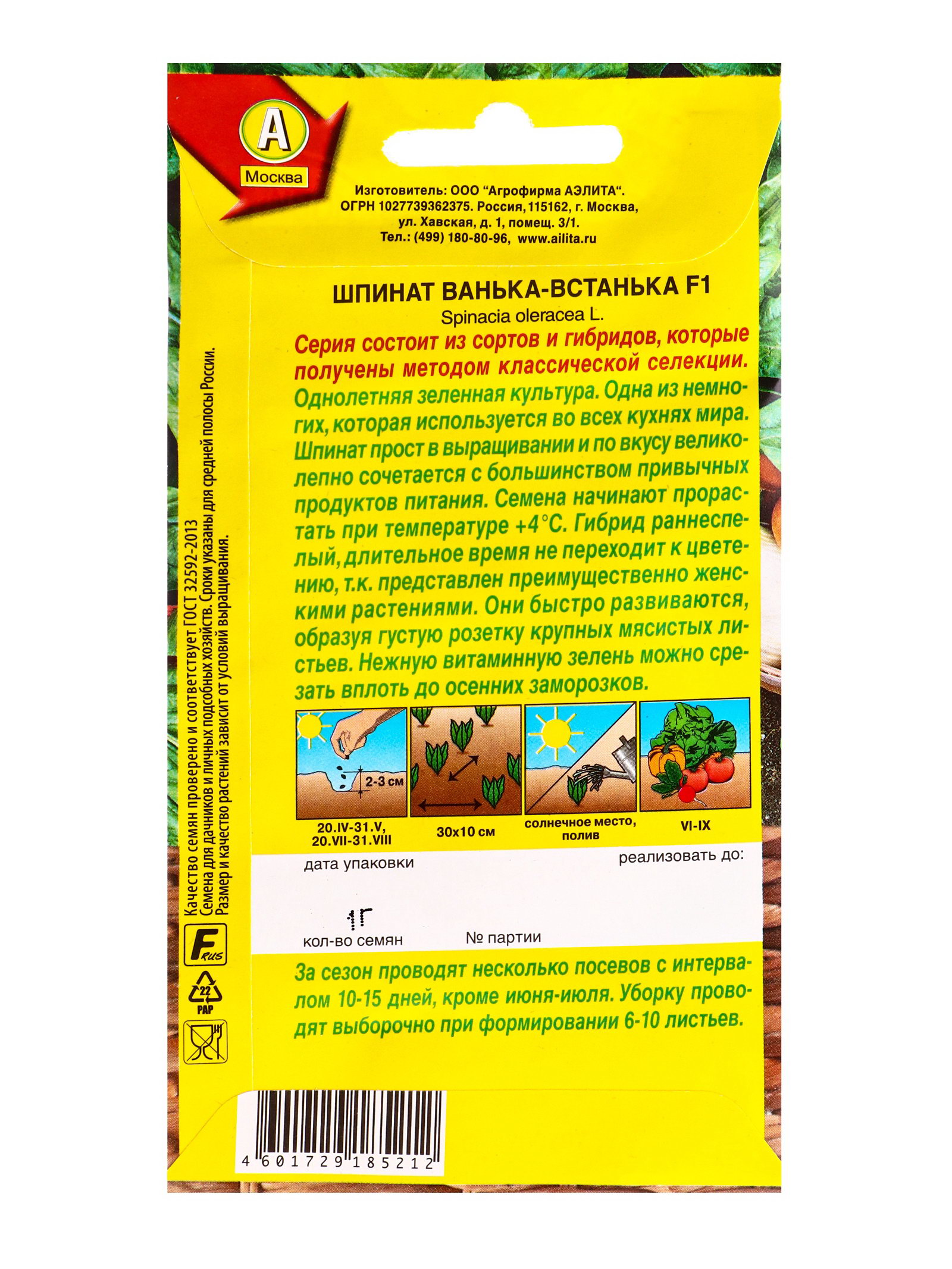 Семена Шпинат Ванька-встанька F1 Профи-Аэлита, Ц/П,1 г, Агрофирма АЭЛИТА, Россия