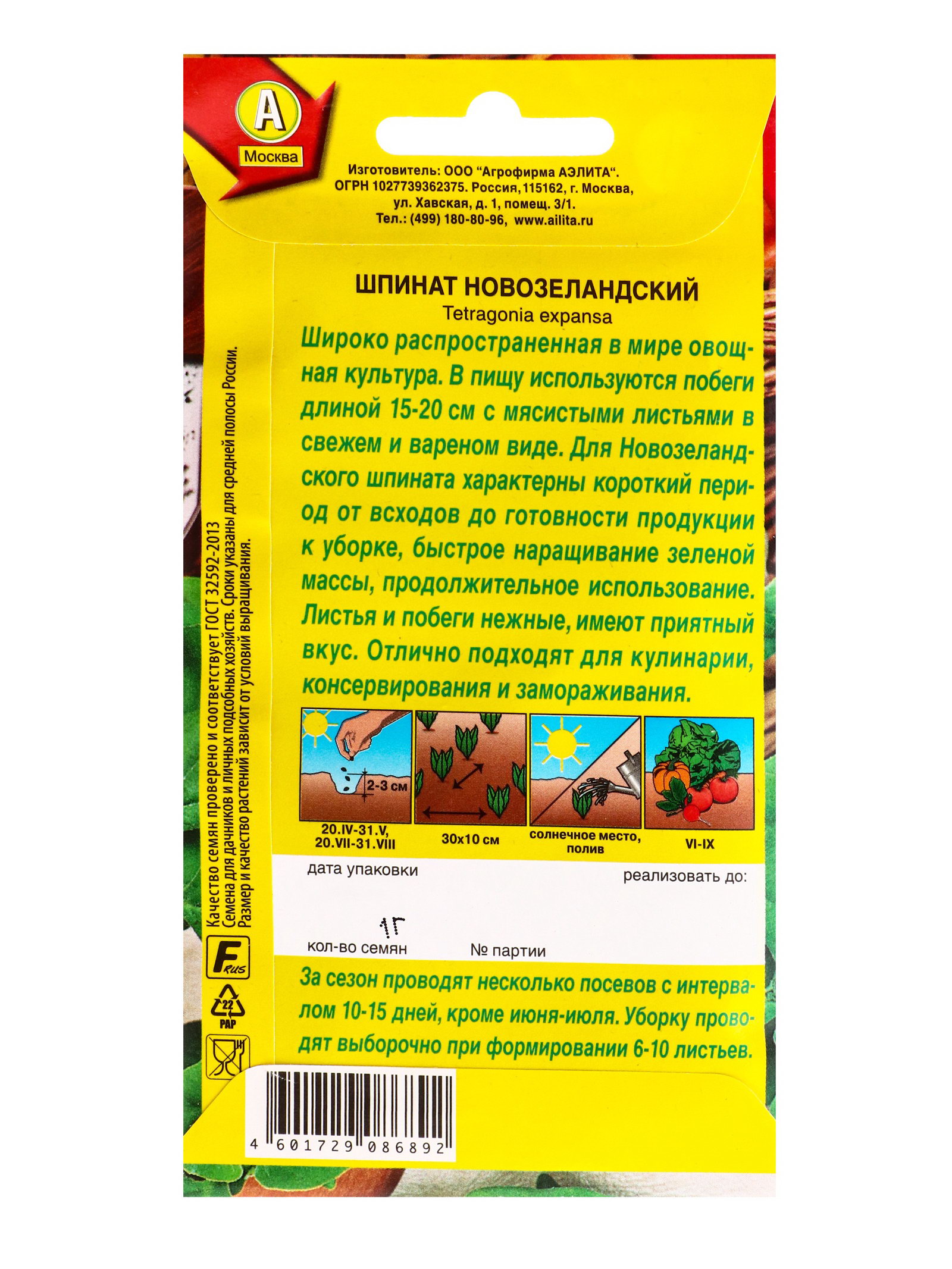 Семена Шпинат Новозеландский, Ц/П,1 г, Агрофирма АЭЛИТА, Россия