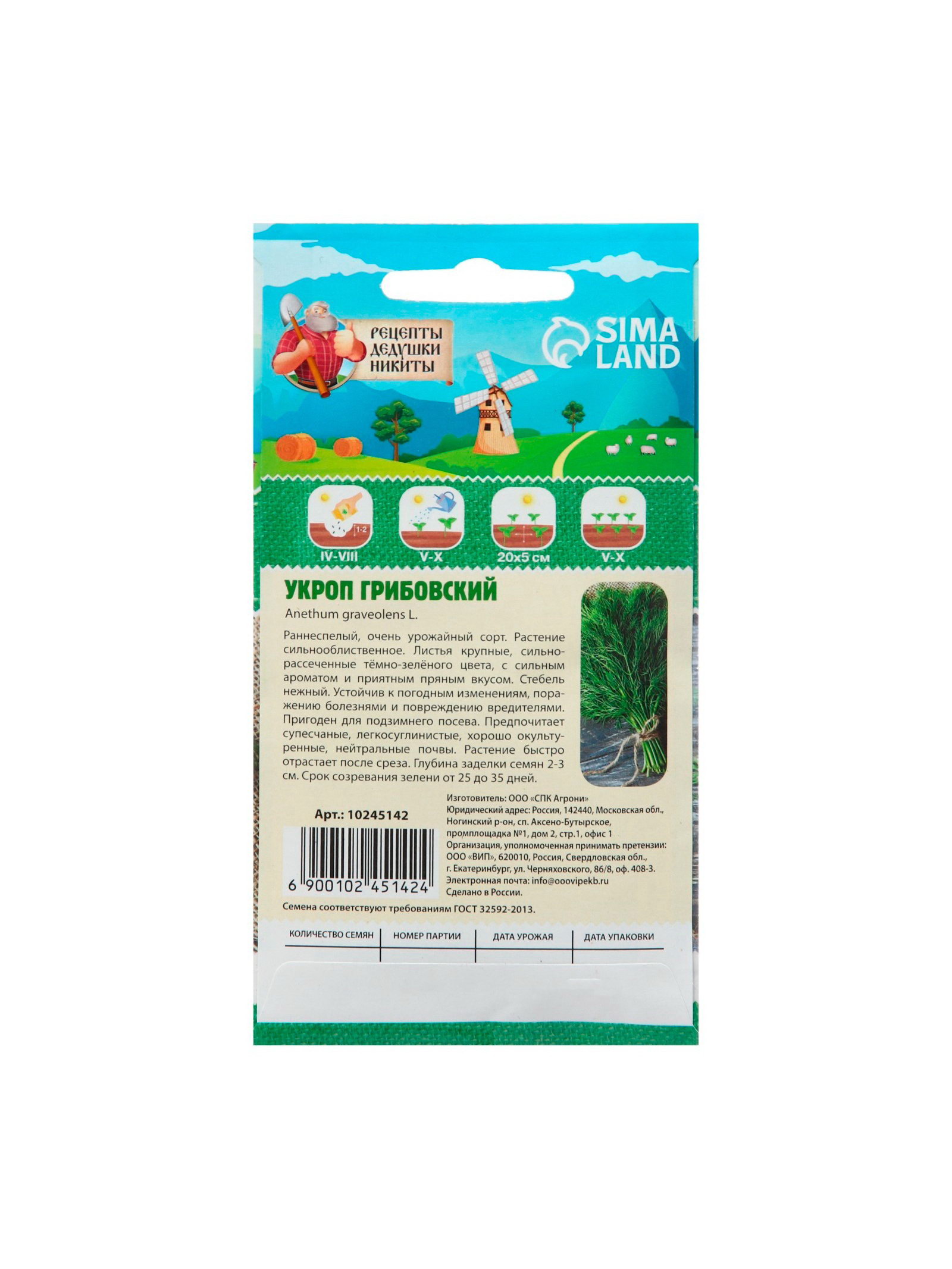 Вид: Простые семена, Семечки, Укроп Урожай: Август - Сентябрь, Июнь - Июль Посев (посадка) в грунт: Апрель, Июль, Июнь, Май Размер упаковки: 8 x 0.1 x 15 см. Температурное ограничение: Нет Место выращивания: Открытый грунт Сроки созревания: Ранний Упаковка: Цветная Сорт или гибрид: Сорт Применение: Душистые (на зелень, в салаты, в блюда) Можно выращивать на подоконнике: Да tnved: 1209999900 tnved: 1209999900 Семена укропа "Грибовский", 2 г Укроп "Грибовский" это один из самых популярных сортов, известный своим насыщенным вкусом и ароматом. Его пышные кустики прекрасно дополнят любые блюда, добавляя свежесть и пикантность. Этот сорт легко выращивать и подходит как для открытого грунта, так и для теплиц. Укроп "Грибовский" станет отличным дополнением к вашему огороду и незаменимым ингредиентом на вашей кухне. Размер или масса плода: Укроп не образует плодов в привычном понимании, семена имеют округлую форму и размер около 3-5 мм Срок созревания: 40-50 дней после посева. Урожайность: 1,5-2,5 кг с 1 ?2. Цвет: Листья ярко-зеленые, насыщенные. Вкус: Пряный, с ярким анисовым ароматом. Форма: Листья перистые, тонкие и нежные, образующие густые кустики. Агротехника и советы при посеве