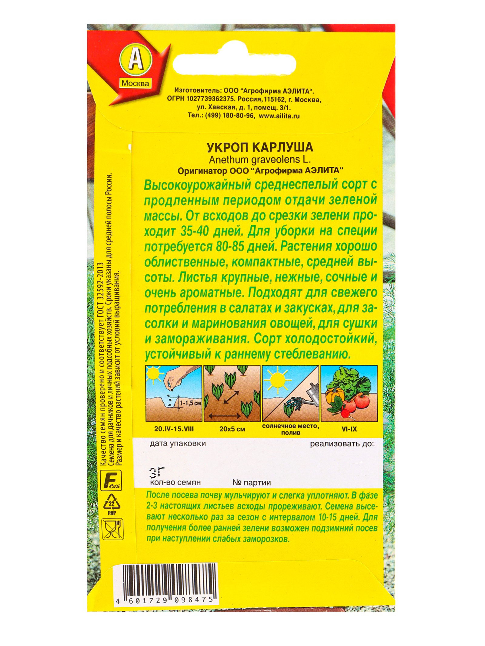 Семена Укроп Карлуша Ор. А, Ц/П,3 г, Агрофирма АЭЛИТА, Россия