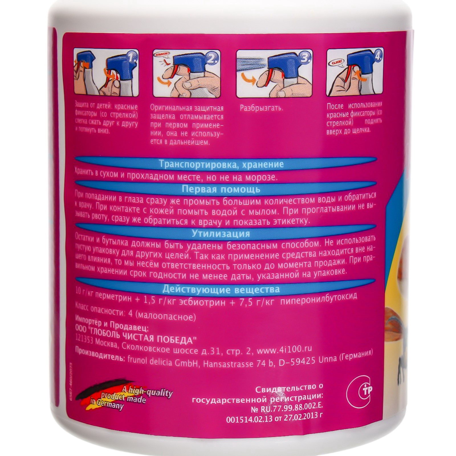 Размер упаковки: 9 x 9 x 21 см. Область применения: От всех насекомых tnved: 4002800000 tnved: 4002800000 Вид средства: Уничтожитель Форма средства: Спрей Температурное ограничение: Нет "Спрей от ос и шершней "Wespex Quick" - специально разработанный профессиональный высокоэффективный спрей, предназначенный для борьбы борьбы с осами, шершнями, пчелами и другими насекомыми. Благодаря наличию специально подобранных веществ препарат Wespex Quick действует мгновенно и сохраняет действие длительное время. Средство произведено в Германии и отвечает всем требованиям безопасности. Применение: Средство является готовым к применению препаратом для опрыскивания При борьбе с осами следует обработать поверхности в непосредственной близости от их гнезд Постепенно приблизиться к гнезду и опрыскать все поверхности совсем близко к гнезду В конце необходимо вставить носик опрыскивателя в гнездо и еще раз распылить средство Wespex Quick внутри него Основные преимущества Wespex Quick: высокая эффективность, небольшой расход и безопасность. Объем флакона - 500мл Состав: 5гр/кг перметрин, 1г/кг пуретрин, 6г/кг пиперонилбутоксид Не распылять против ветра!" | ||