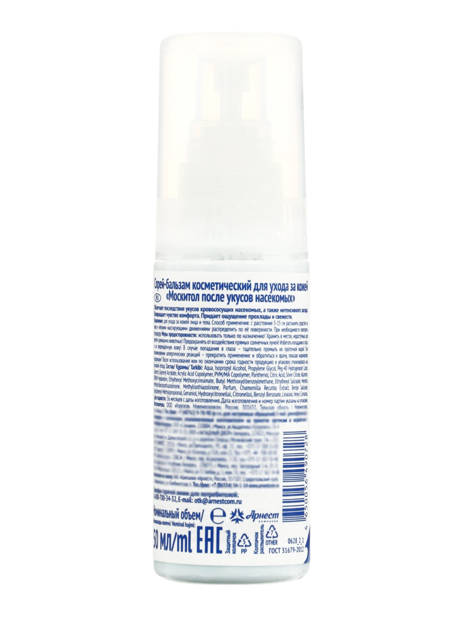Форма средства: Бальзам, Спрей Размер упаковки: 3.5 x 11.5 x 3.5 см. tnved: 3808918000 Температурное ограничение: Нет Область применения: От комаров Спрей-бальзам после укусов насекомых "Москитол" - это эффективное средство для облегчения состояния после укусов комаров, мошек, слепней и других насекомых. Удобный формат спрея позволяет наносить средство на большие участки кожи без контакта рук, быстро снимая зуд, покраснение и отек. Флакона 50 мл хватит на целый сезон для всей семьи.