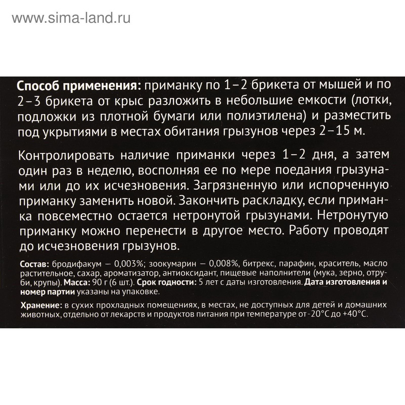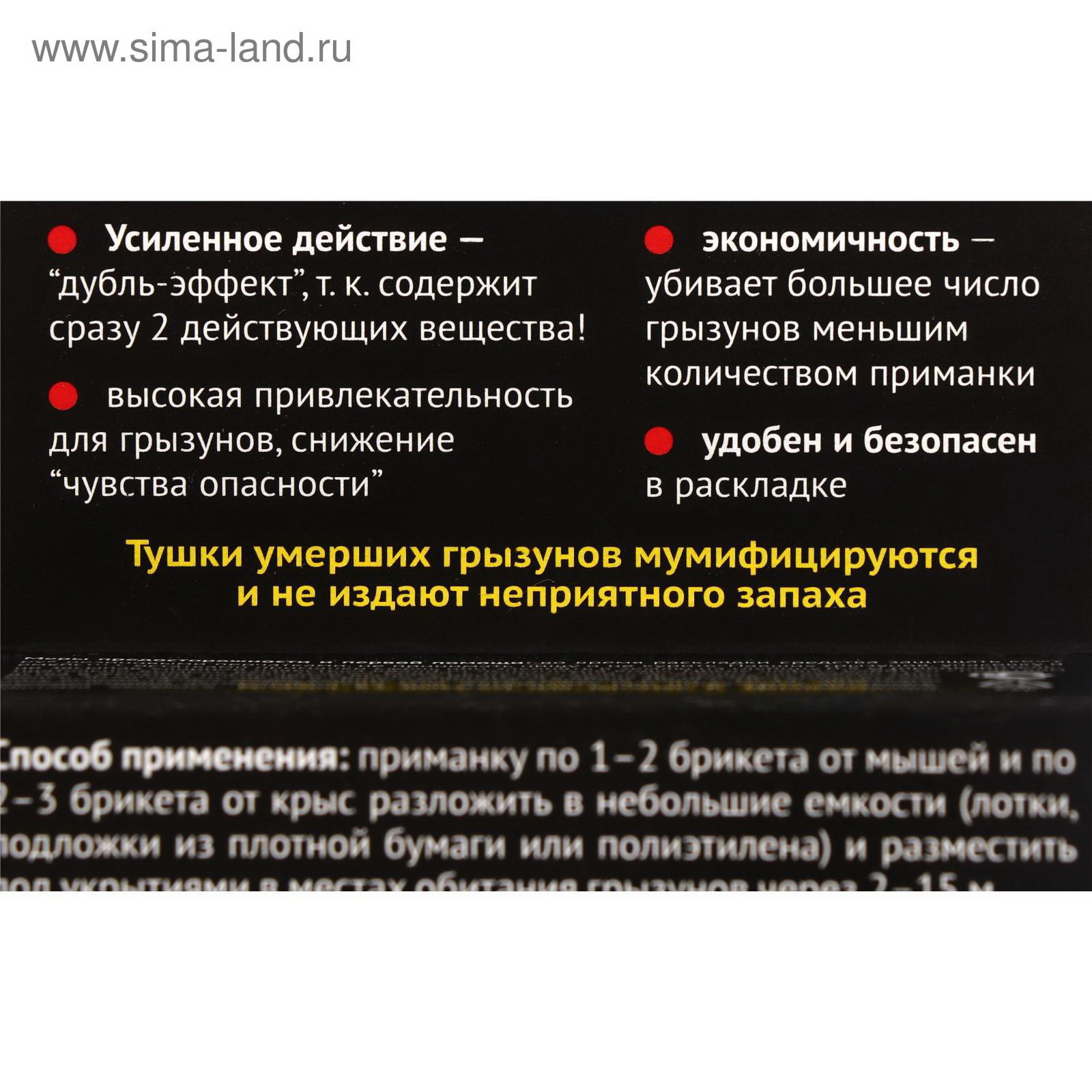 Размер упаковки: 8 x 2.5 x 8.5 см. tnved: 3808992000 Температурное ограничение: Нет Область применения: От грызунов Вес, г: 90 Блок-брикет для уничтожения грызунов представляет собой средство, разработанное специально для эффективной борьбы с синантропными и экзоантропными грызунами, такими как крысы (серые, черные, водяные), домовые мыши, полевки (обыкновенные и рыжие), суслики, а также другие грызуны аналогичного образа питания и размножения. Состав блок-брикета включает в себя два действующих вещества, что обеспечивает усиленное действие "дубль-эффект". Это позволяет достичь более высокой эффективности в уничтожении грызунов и обеспечивает более быстрый результат. Одним из ключевых преимуществ блок-брикета является его высокая привлекательность для грызунов. Это снижает "чувство опасности" у животных, что делает приманку более привлекательной и увеличивает вероятность ее употребления грызунами. Экономичность использования блок-брикета также является важным фактором. Благодаря его высокой эффективности, для уничтожения большего числа грызунов требуется меньшее количество приманки. Это позволяет сэкономить ресурсы и сократить затраты на борьбу с грызунами. Применение блок-брикета для уничтожения грызунов очень удобно и безопасно. Он легко раскладывается в местах обитания грызунов и не представляет опасности для людей и домашних животных. Благодаря своей специальной форме, блок-брикет удобно закладывается в труднодоступных местах, что повышает его эффективность. Рекомендуемые места для раскладки блок-брикета включают территории складов, производственных помещений, а также домашние хозяйства. Также рекомендуется использовать блок-брикет для уничтожения грызунов на открытых территориях, таких как загоны для скота, фермерские хозяйства и другие места, где присутствует опасность появления грызунов. Для достижения максимальной эффективности рекомендуется следовать инструкции по применению блок-брикета, предоставленной производителем. Также важно соблюдать меры предосторожности при работе с приманкой и обеспечить безопасное хранение и использование. В целом, блок-брикет для уничтожения грызунов представляет собой эффективное и безопасное средство для борьбы с грызунами различных видов. Его высокая привлекательность для грызунов, экономичность и удобство использования делают его отличным выбором для обеспечения защиты от нежелательных гостей на территории складов, производственных помещений и домашних хозяйств. | ||