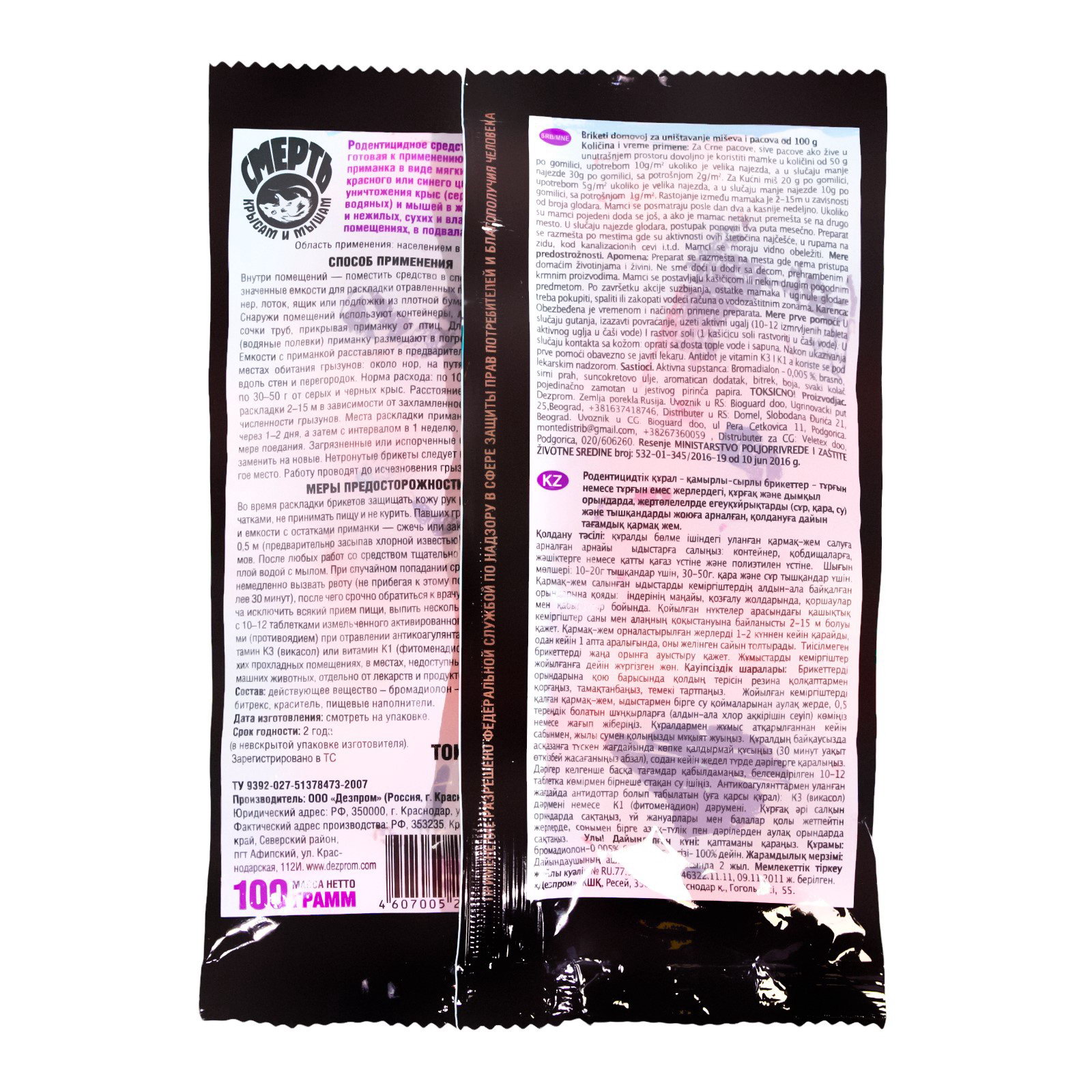 Размер упаковки: 12.5 x 0.7 x 17 см. tnved: 3808992000 Температурное ограничение: Нет Область применения: От грызунов Вес, г: 100 Рекомендуются для борьбы с крысами (черными, серыми), мышами и другими грызунами. Тесто-брикеты упакованы в индивидуальные пакетики, что облегчает раскладку приманки. Специальная пищевая основа и уникальная технология изготовления делает приманку привлекательной для грызунов даже при наличии большого выбора еды. Для большего привлечения содержит натуральные пищевые компоненты Средство обладает высокой родентицидной активностью, гибель грызунов наступает на 2-10 день после поедания приманки. Состав: