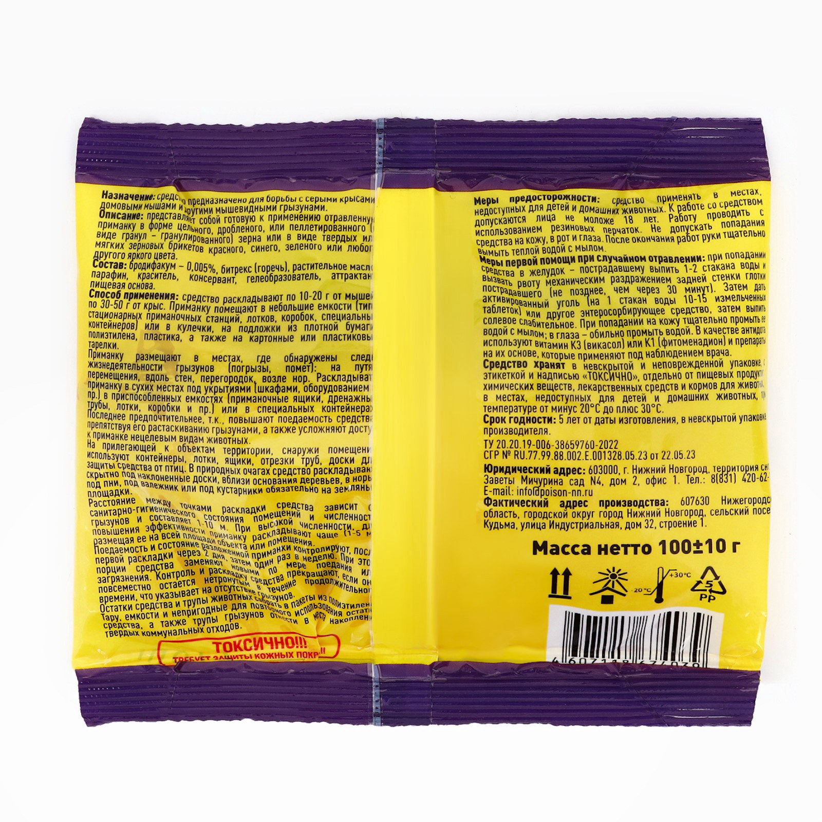 Размер упаковки: 14 x 2 x 13 см. Температурное ограничение: Нет Область применения: От грызунов tnved: 3808992000 Форма средства: Брикеты Вес, г: 100 Вид средства: Приманка Тесто-брикеты "Том Кот Бро" эффективное средство для борьбы с грызунами, подходящее для использования в домашних условиях и на промышленных объектах. Этот уникальный продукт избавит ваш дом от нежелательных соседей, а его применение не вызовет трудностей. Преимущества средства