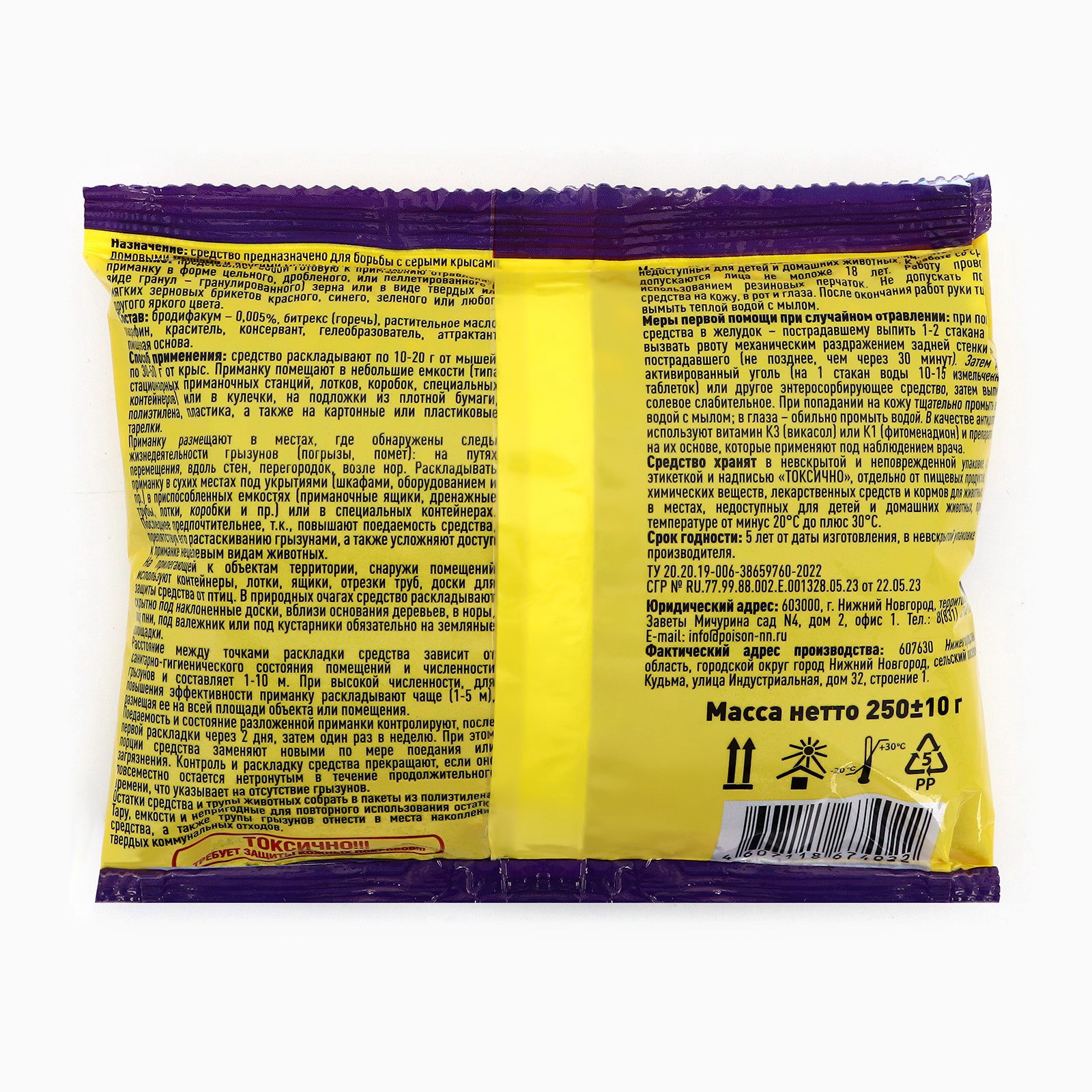 Размер упаковки: 11 x 5 x 14 см. Температурное ограничение: Нет Область применения: От грызунов tnved: 3808992000 Форма средства: Зерно Вид средства: Приманка Вес, г: 250 Зерновая приманка от грызунов "Том Кот Бро" надёжное средство для борьбы с грызунами на основе зерна. Этот продукт специально разработан для защиты вашего дома и участка от незваных гостей, таких как мыши и крысы. Преимущества