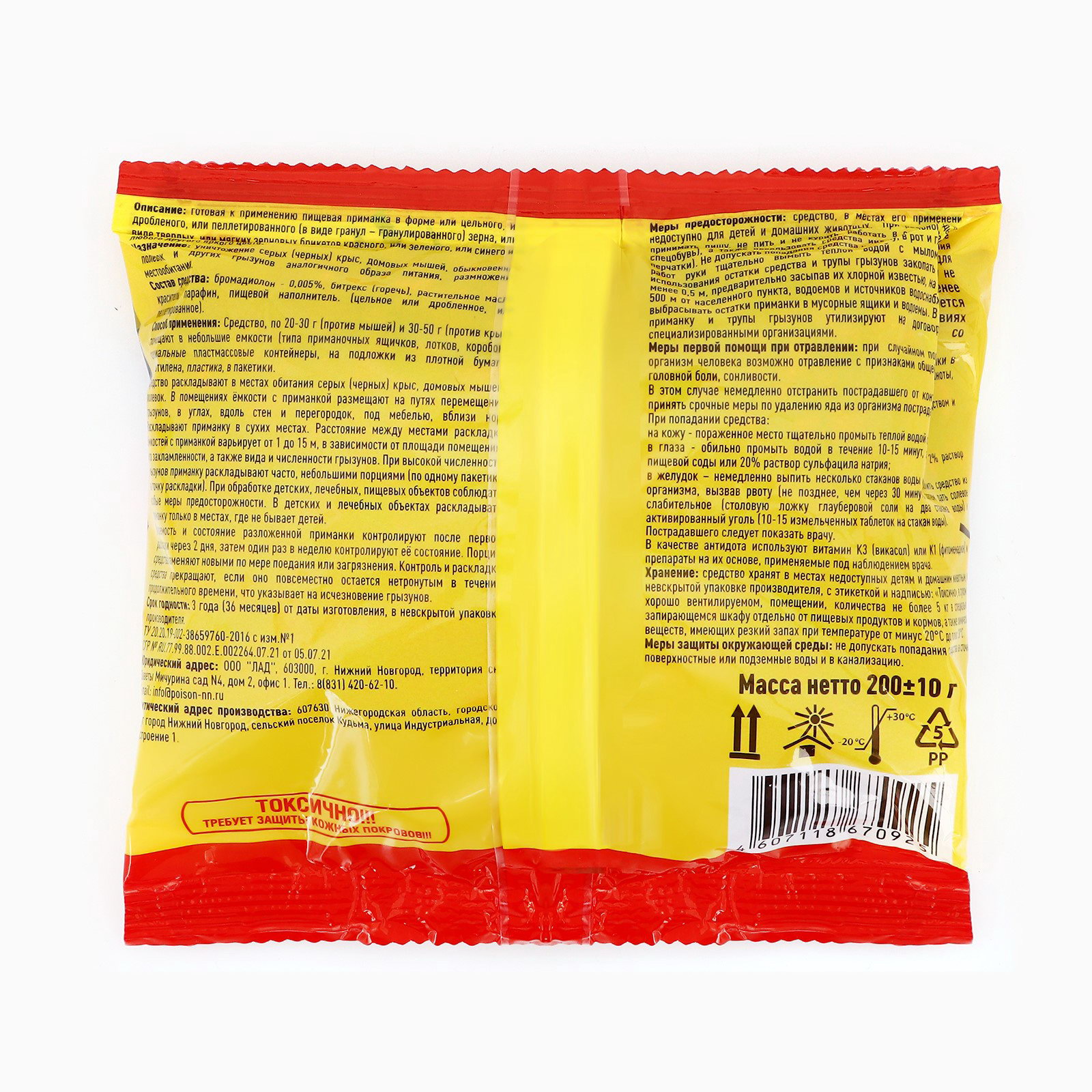 Размер упаковки: 11 x 4 x 14 см. Температурное ограничение: Нет Область применения: От грызунов tnved: 3808992000 Форма средства: Гранулы Вид средства: Приманка Вес, г: 200 Гранулы для борьбы с грызунами "Том Кот" это эффективное средство для владельцев квартир, частных домов и дач, стремящихся защитить свое жилище от незваных гостей. Эти гранулы разработаны специально для уничтожения мышей и крыс в помещениях и на прилегающих территорий. Благодаря особой формуле, продукт привлекателен для грызунов, что способствует быстрому и результативному решению проблемы. Преимущества использования