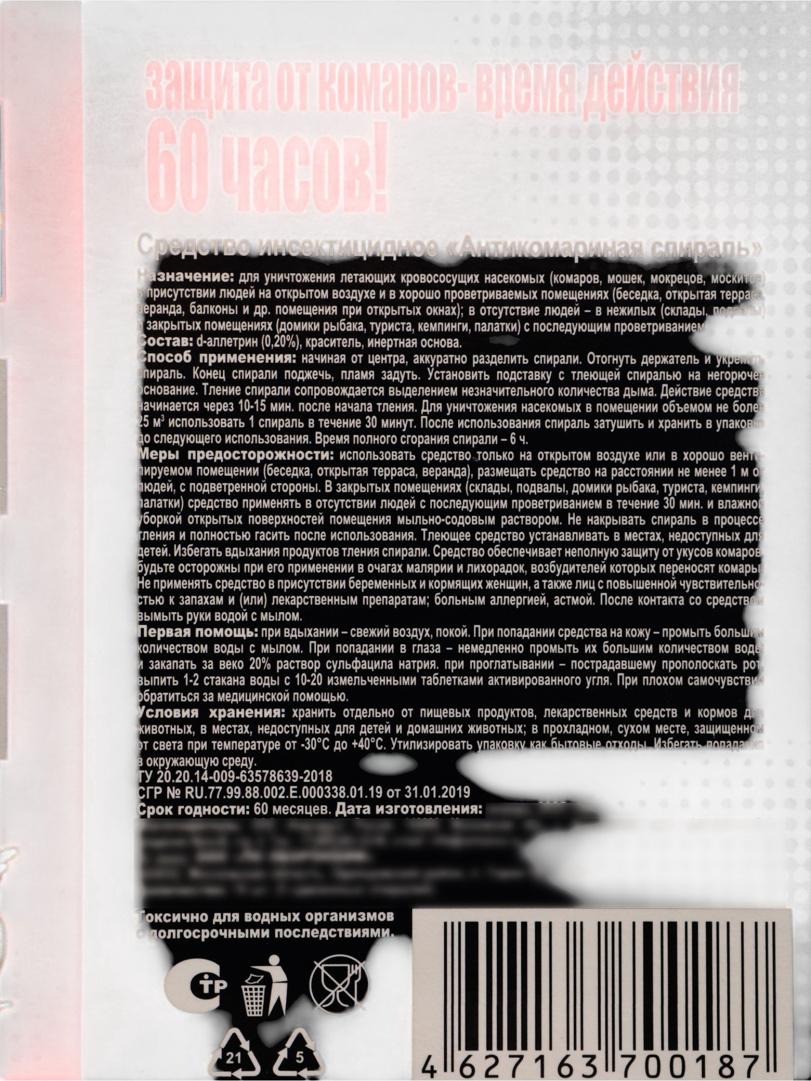 Область применения: От комаров, От москитов, От мошек Размер упаковки: 12.5 x 2.5 x 12.5 см. tnved: 3808911000 Температурное ограничение: Нет Время работы, ч: 60 Тип средства: Инсектицид Форма средства: Спираль Детские: Нет Вид средства: Отпугиватель Назначение: От комаров Угольные спирали от комаров "ДОХС" - это эффективное средство для отпугивания летающих насекомых во время отдыха на природе. Специальный состав, встроенный в угольную основу, при тлении выделяет дым, который создает защитную зону радиусом до 2-3 метров. Упаковка из 10 спиралей общей продолжительностью действия 60 часов обеспечит комфортный отдых на даче, пикнике или в походе.