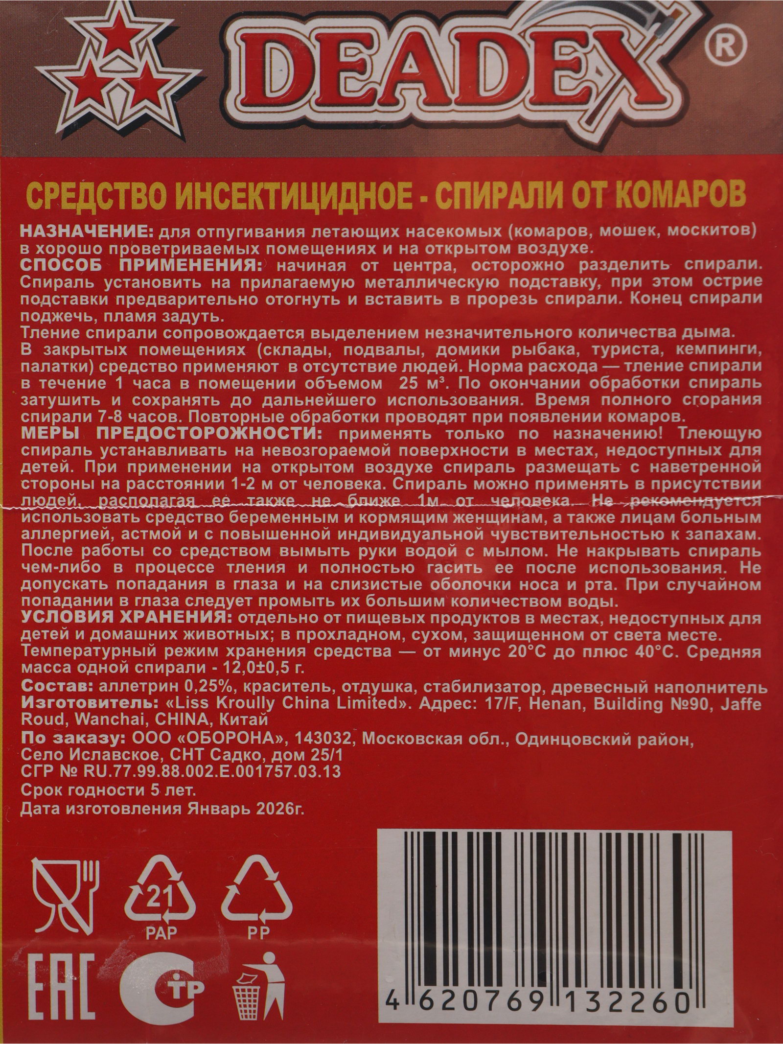 Спирали от комаров DEADEX, красные, 10 шт., Оборонхим, Россия