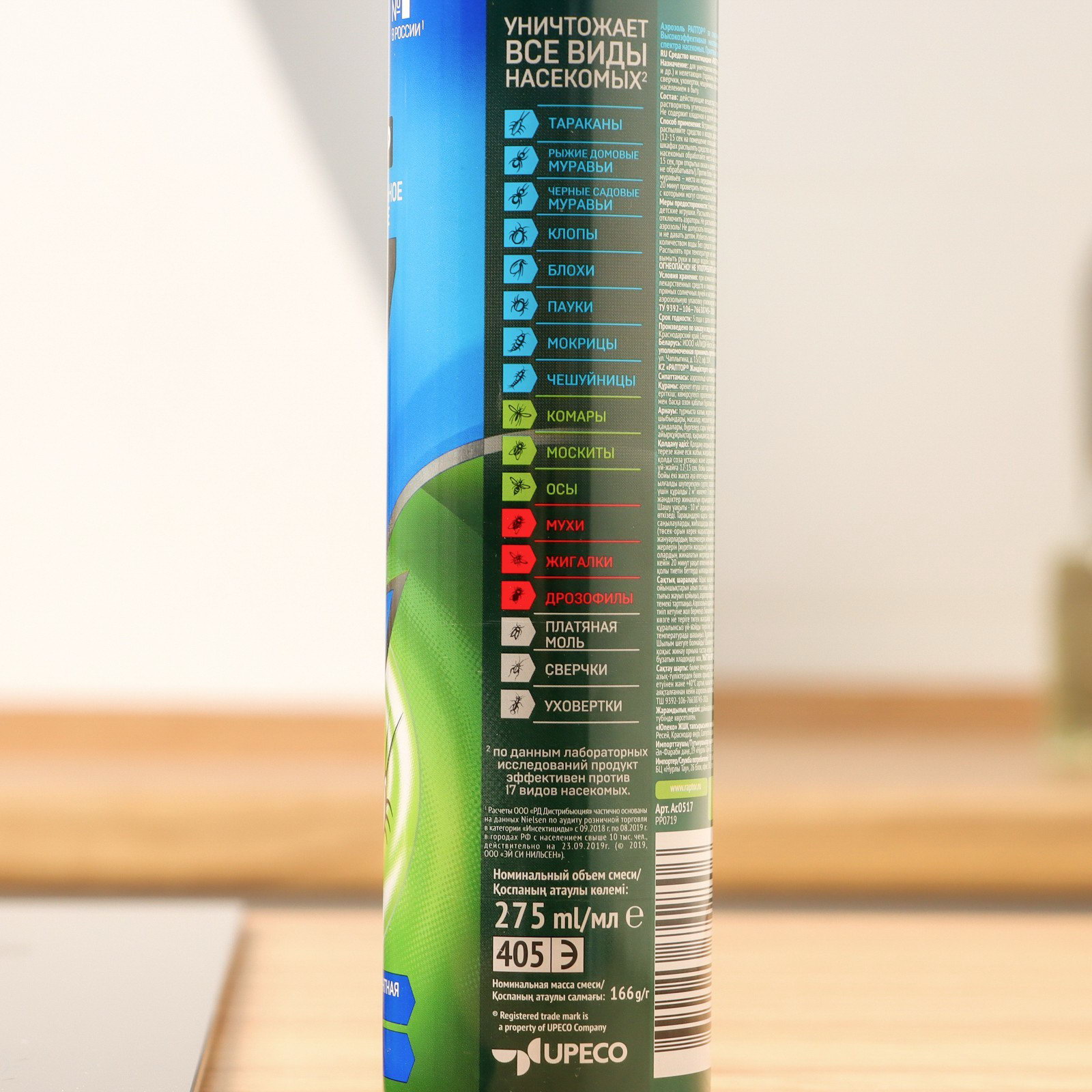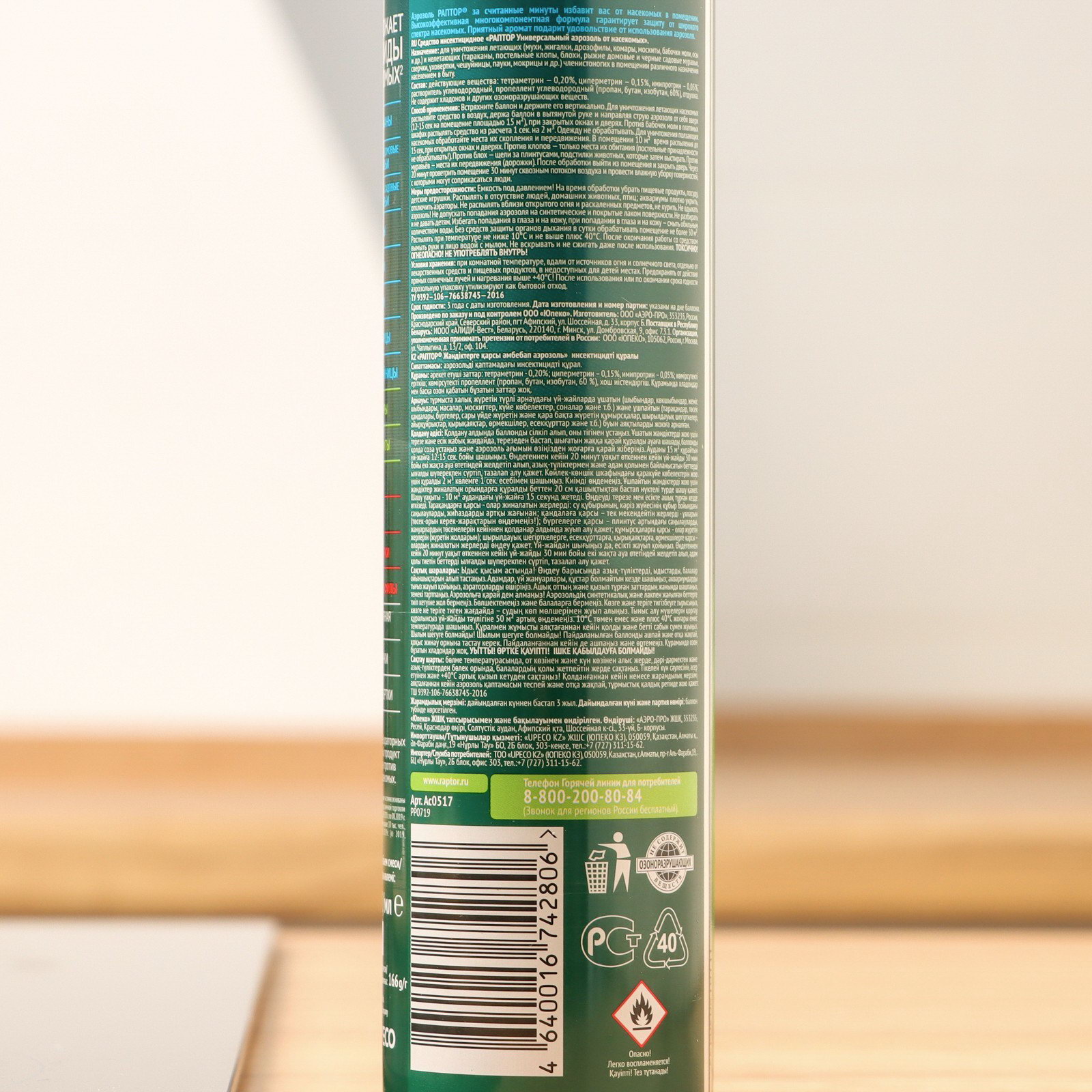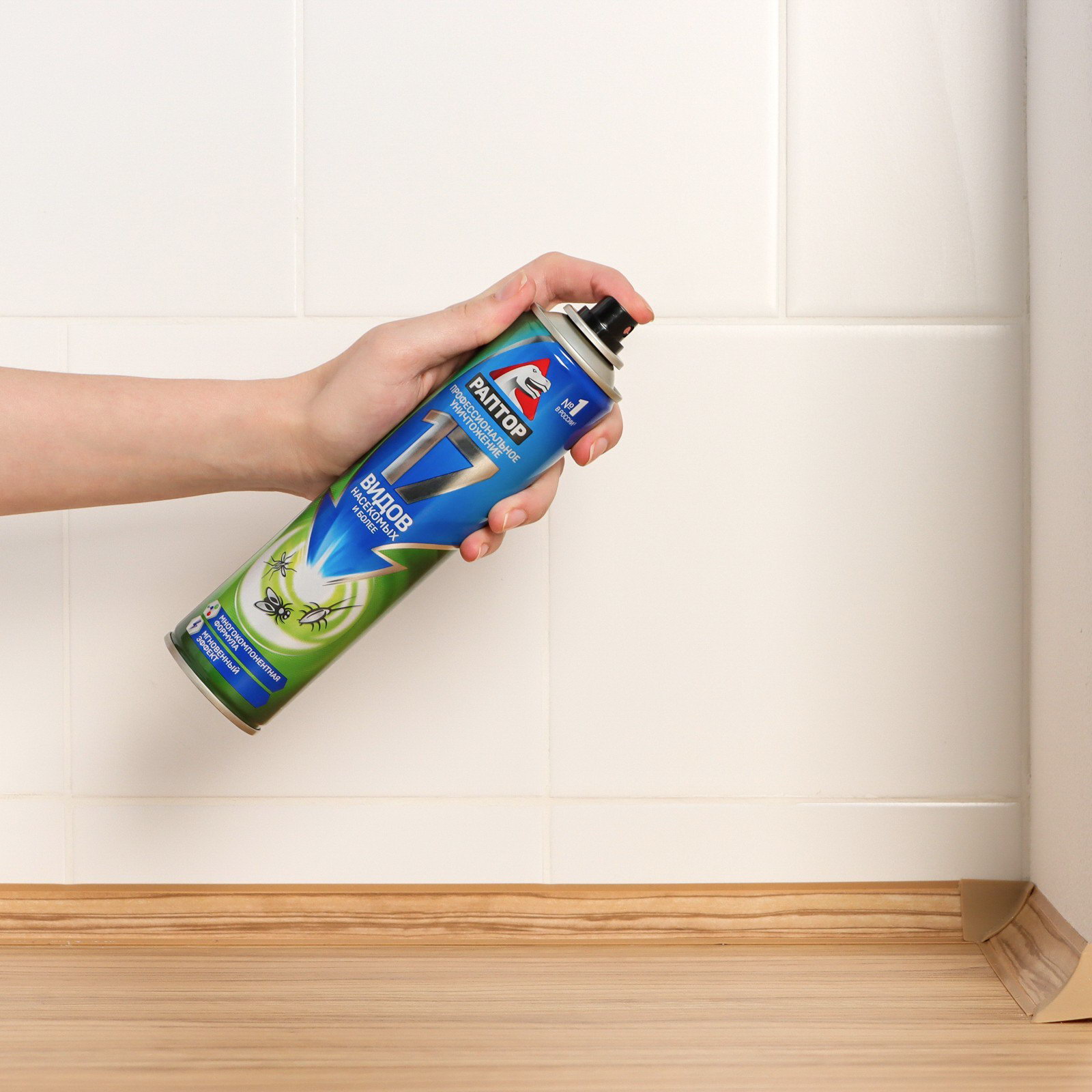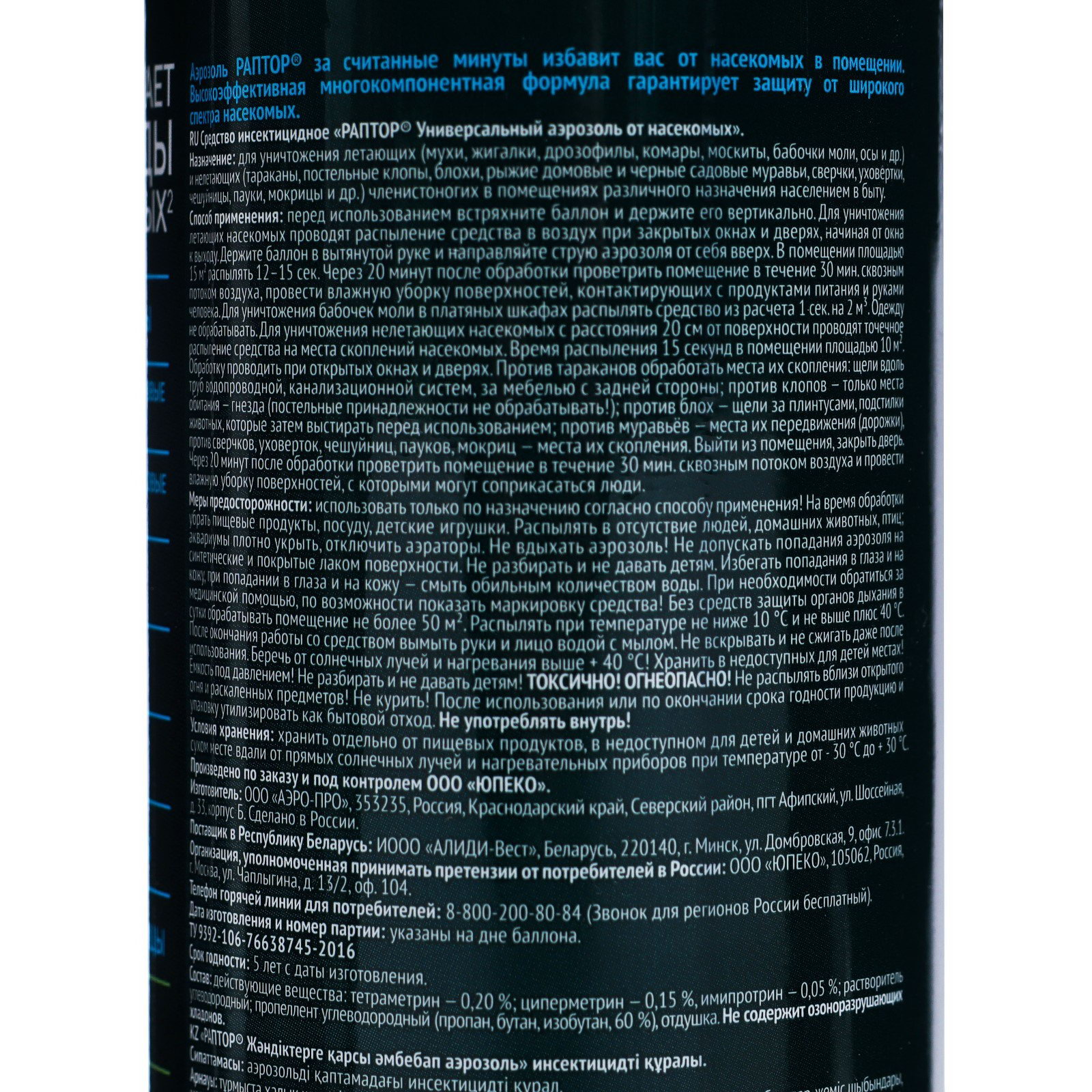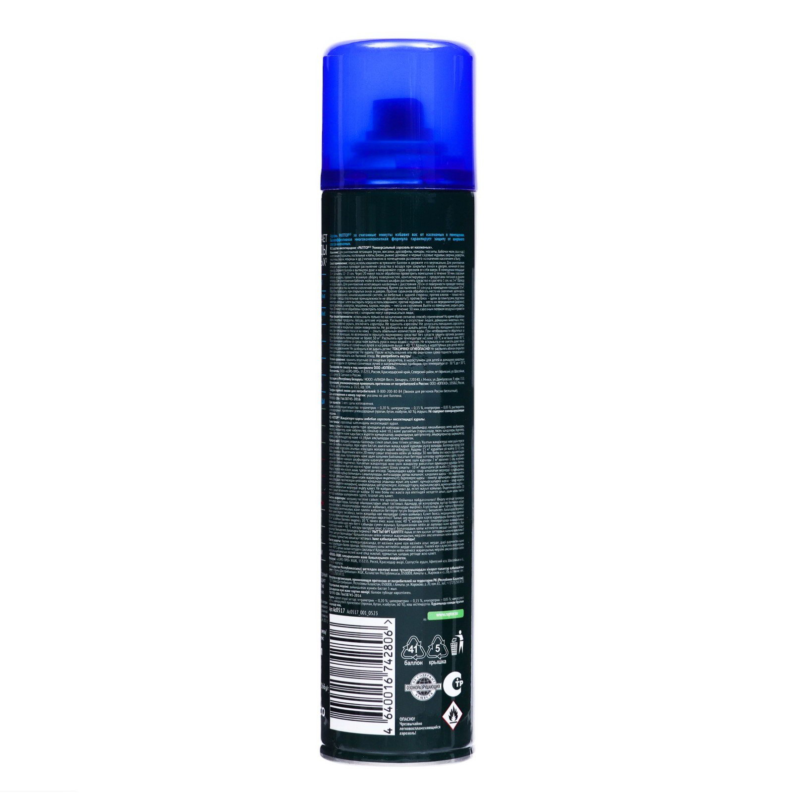 Размер упаковки: 5 x 23.7 x 5 см. Запрет реализации по сегментам: 00000000550 tnved: 3808919000 Универсальный аэрозоль Раптор – эффективное средство защиты от семнадцати видов ползающих и летающих насекомых. Благодаря трем сильным инсектицидам в составе оно не дает возможности для вредителей адаптироваться и выработать иммунитет, оставаясь одинаково действенным от обработки к обработке. Клопы, блохи, тараканы, мухи, муравьи, осы и пауки надолго покинут ваш дом, если обработать его укромные места спреем Раптор. Мощная струя и широкий охват распылителя позволяет проникнуть препарату в самые труднодоступные места. Средство наносится легко и действует мгновенно. Оно не токсично и не оставляет следов и пятен на поверхностях. Наилучших результатов от применения аэрозоля можно добиться, распыляя средство во всех помещениях, где обнаружены насекомые, одновременно. Повторную обработку для закрепления эффекта следует провести через месяц.Состав Средство отличается уникальным составом, в котором присутствуют три сильнодействующих инсектицида: тетраметрин – 0,20%; циперметрин – 0,15%, имипротрин – 0,05%. Вспомогательными веществами являются: растворитель углеводородный; пропеллент углеводородный (пропан, бутан, изобутан, 60 %), ароматическая отдушка. Спрей не содержит хладонов и озоноразрушающих компонентов.Способ применения Перед применением следует снять защитный пластиковый колпачок, хорошо встряхнуть баллон. Удерживая его вертикально на вытянутой руке, распылите аэрозоль с расстояния в 20 см на места передвижения, скопления или потенциального обитания насекомых. Уделите особое внимание таким зонам: щели в стенах и полу, зазоры за плинтусами и дверными коробками, под подоконниками, задние поверхности мебели, картин, ковры и подстилки для животных, санузлы, мусоропроводы, вентиляционные отверстия, вдоль трубопровода и канализационных труб. Распыляйте в течение 15 секунд. Через 15 минут после обработки помещения, его следует проветрить не менее 30 минут. | ||