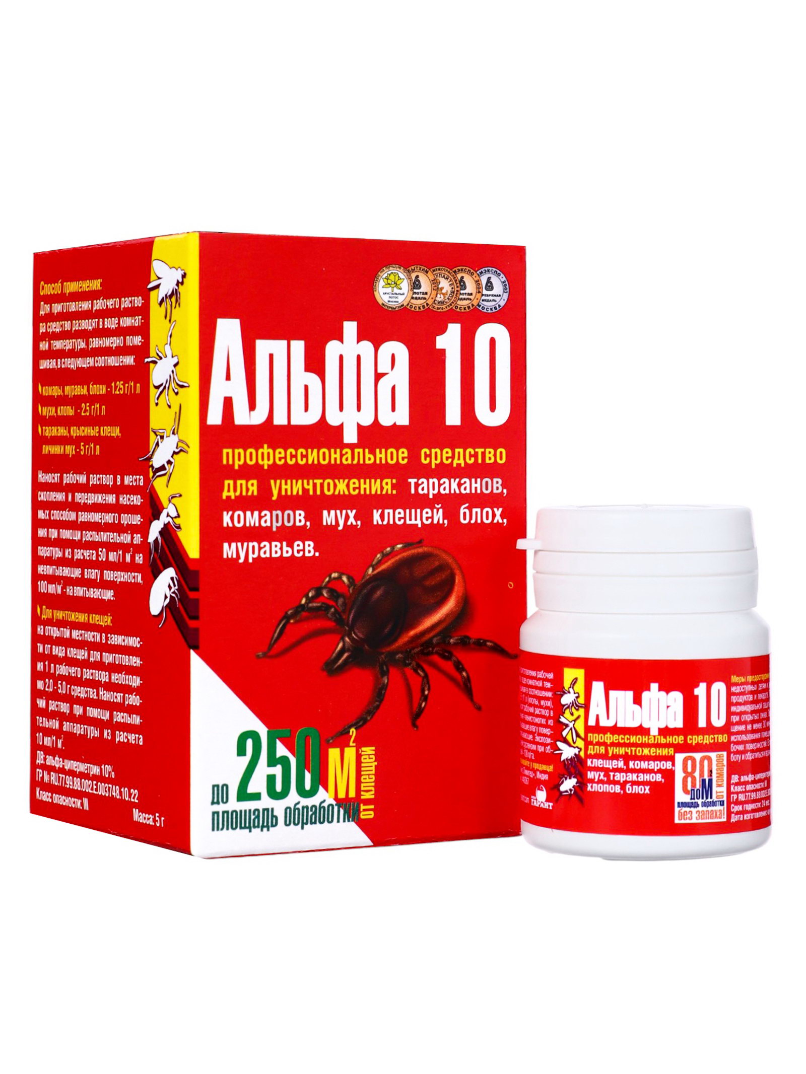 Область применения: От блох, От всех насекомых, От клещей, От комаров, От муравьев, От мух, От тараканов Размер упаковки: 5.5 x 5.5 x 10 см. Действующие вещества: Циперметрин Способ нанесения: Опрыскивание tnved: 3808919000 Температурное ограничение: Нет Средство выпускается в форме смачивающегося порошка, который перед применением необходимо развести водой. Обладает быстрым инсектицидным эффектом и остаётся активным на обработанных поверхностях 6–8 недель. Образуемая при нанесении плёнка раствора устойчива к внешним факторам и действует на насекомых при повторном появлении.Средство "Альфа 10" не оставляет следов и запаха. Содержимое упаковки рассчитано на приготовление 1 литра рабочего раствора для обработки помещений до 20 ?2.Действующее вещество: альфациперметрин (10 %).Назначение: для уничтожения тараканов, муравьёв, клопов, блох, мух, комаров, иксодовых клещей.Способ применения: для приготовления рабочего раствора средство разводят в воде комнатной температуры, равномерно помешивая | ||