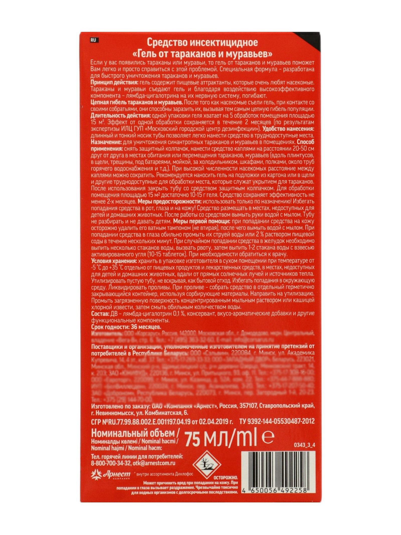 Область применения: От муравьев, От тараканов Размер упаковки: 18 x 9 x 4.5 см. tnved: 3808918000 Температурное ограничение: Нет Вид средства: Уничтожитель Действующие вещества: Лямбда-цигалотрин Способ нанесения: Нанесение на поверхность Форма средства: Гель Инсектицидный гель "Дихлофос НЕО" - это эффективное средство для уничтожения тараканов и муравьев в помещении. Действующее вещество лямбда-цигалотрин обеспечивает быструю гибель насекомых при контакте и при поедании геля в качестве приманки. Удобный тюбик 75 мл с носиком-аппликатором позволяет наносить гель точечно в любые труднодоступные места.