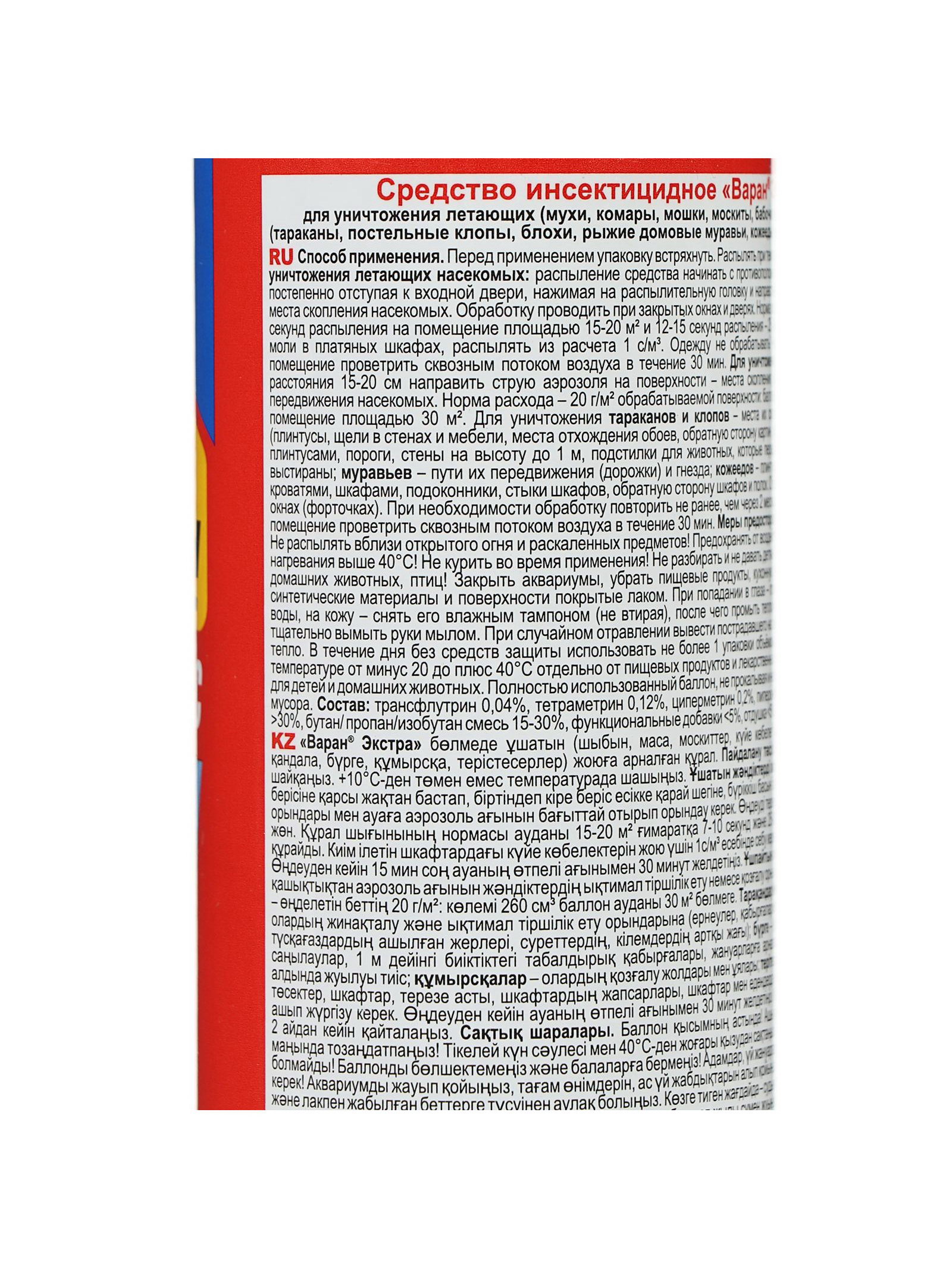 Размер упаковки: 4.5 x 4.5 x 21 см. Область применения: Универсальное tnved: 3808918000 tnved: 3808918000 Вид средства: Уничтожитель Форма средства: Аэрозоль На природе и дома многие люди сталкиваются с клещами, клопами, москитами и другими опасными насекомыми, которые способны причинить массу вреда. Они переносят инфекцию, пьют вашу кровь и просто раздражают своим внешним видом. Вы устали бороться с ними? Дихлофос от торговой марки "Варан" высокоэффективное средство для уничтожения ползающих (тараканов, муравьёв, клопов и т. д.), а также летающих насекомых (мух, москитов, комаров). Способ применения: перед использованием хорошо взболтайте, распылите. Состав: тетраметрин 0,12 %, циперметрин 0,2 %, пиперонилбутоксид 0,4 %, отдушка менее 5 %, функциональные добавки менее 5 %, смесь бутан / пропан / изобутан более 30 %, растворители более 30 %. Способ применения: перед использованием хорошо взболтайте, распылите. | ||