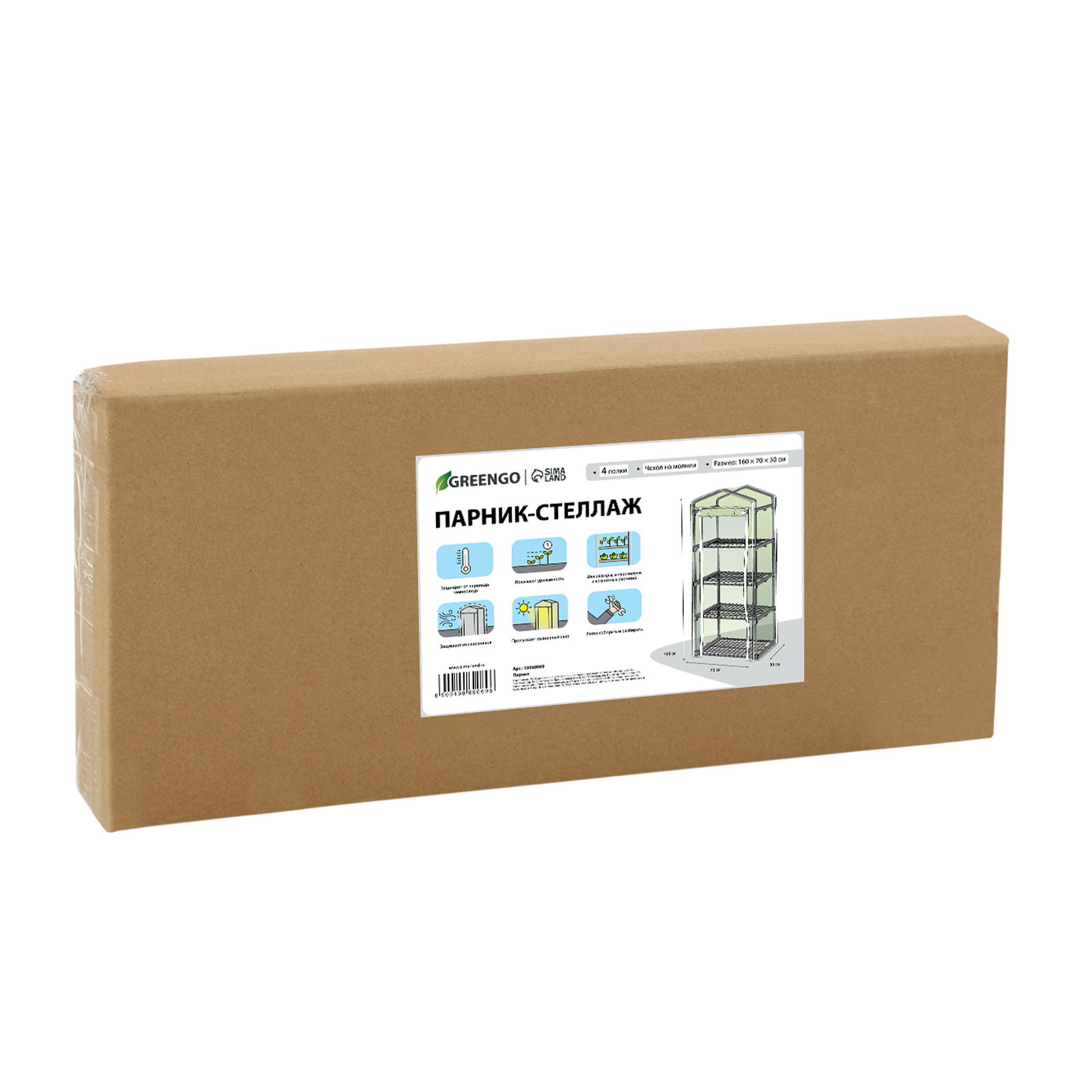 Парник-стеллаж, 4 полки, 160x70x30 см, металлический каркас d=16 мм, чехол плёнка 80 мкм, 30x70x160 см., Greengo, Китай