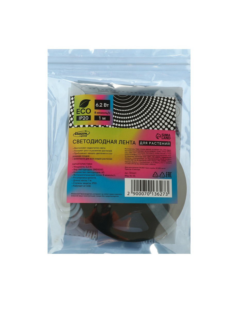 Фитолента для растений светодиодная, 6.2 Вт, 1 м, IP20, 5 В, 60 LED/м, диммер, USB, SMD5050, мультиспектральная, 13x16x2 см., Luazon Lighting, Китай