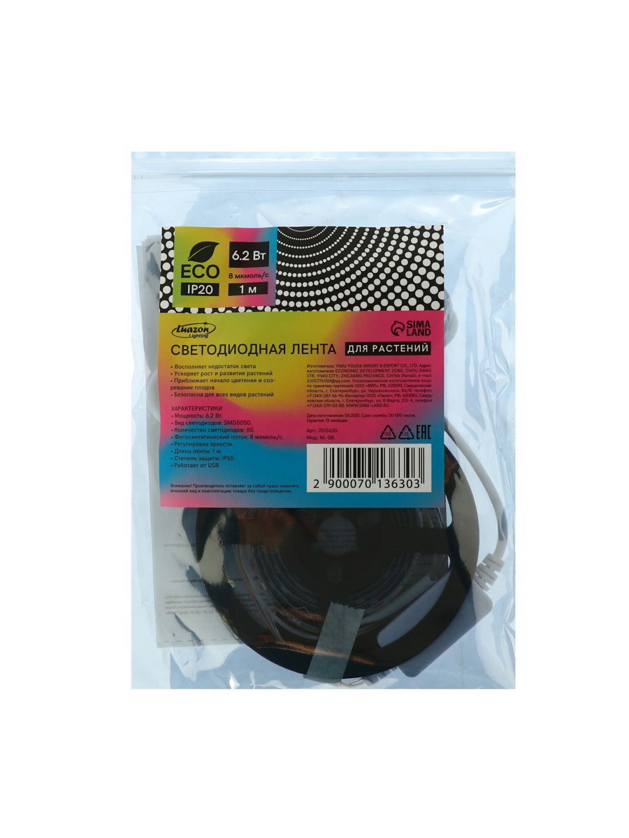Фитолента для растений светодиодная, 6.2 Вт, 1 м, IP65, 5 В, 60 LED/м, диммер, USB, SMD5050, мультиспектральная, 13x16x2 см., Luazon Lighting, Китай