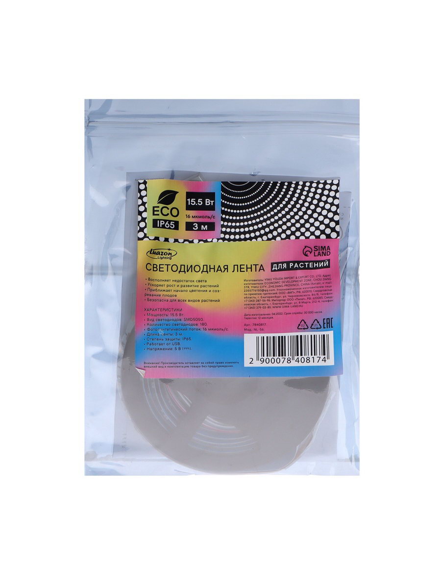 Фитолента для растений светодиодная, 10.3 Вт, 3 м, IP65, 5 В, 60 LED/м, USB, SMD5050, мультиспектральная, 14x15x1.5 см., Luazon Lighting, Китай
