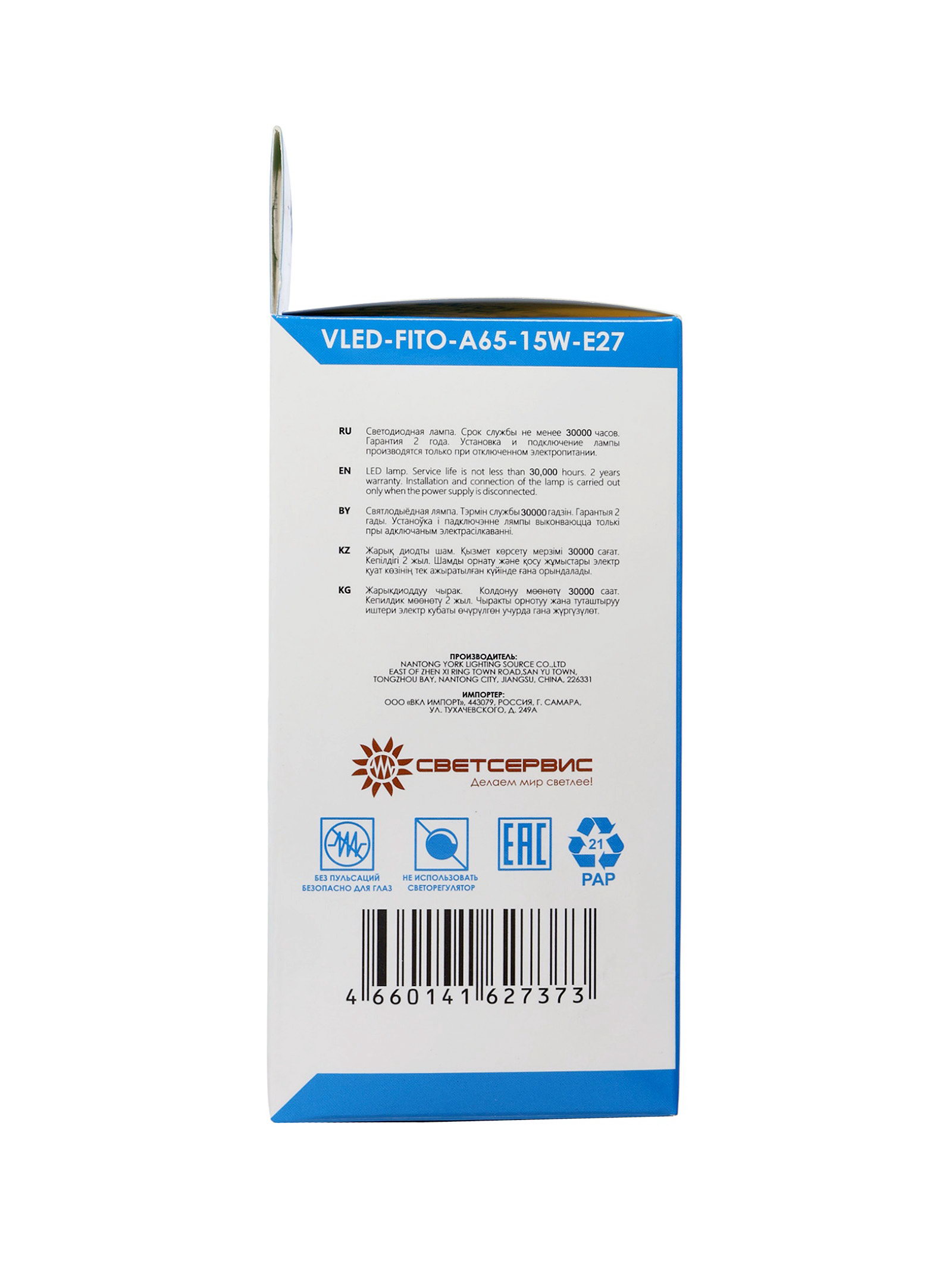Фитолампа для растений VKL Electric, A65, 15 Вт, E27, IP20, красно-синий спектр, Китай