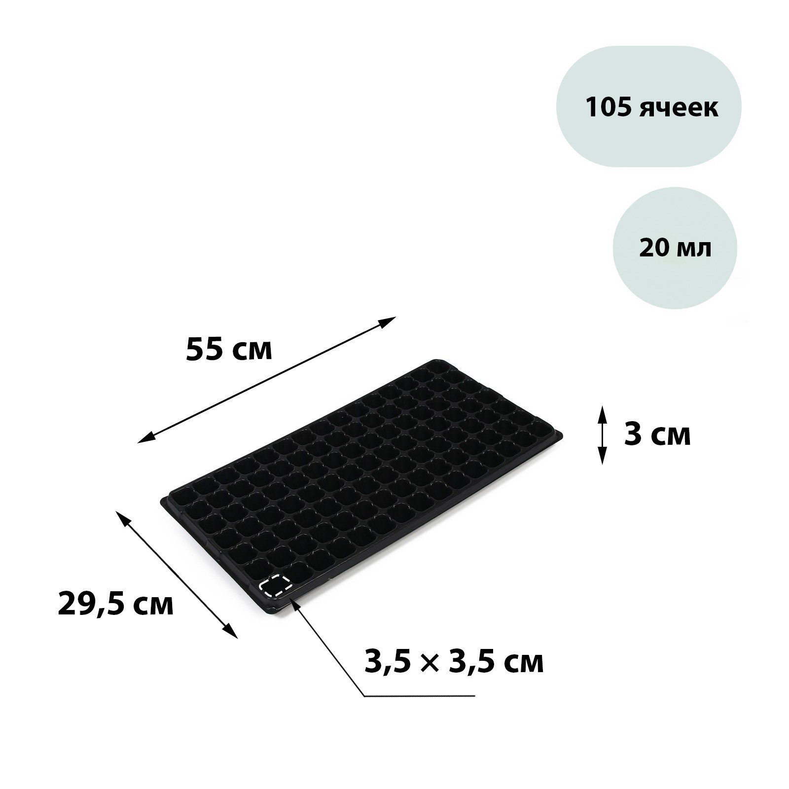 Размер упаковки: 28 x 4 x 54 см. Количество ячеек: 105 Цвет: Чёрный tnved: 3926909700 Объём ячейки, мл: 20 Рассадная кассета на 105 ячеек профессиональное решение для массового выращивания сеянцев и мелкой рассады. Большое количество ячеек помогает организовать посадки в промышленных масштабах.