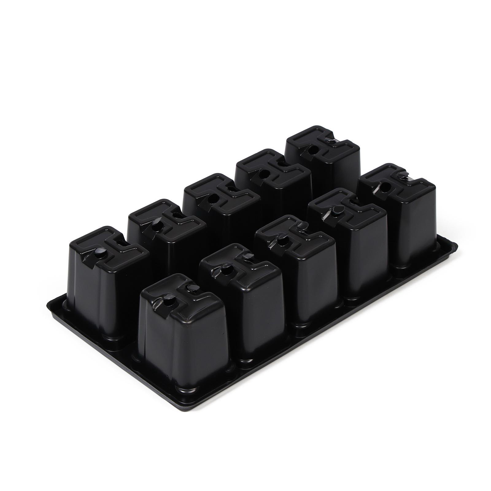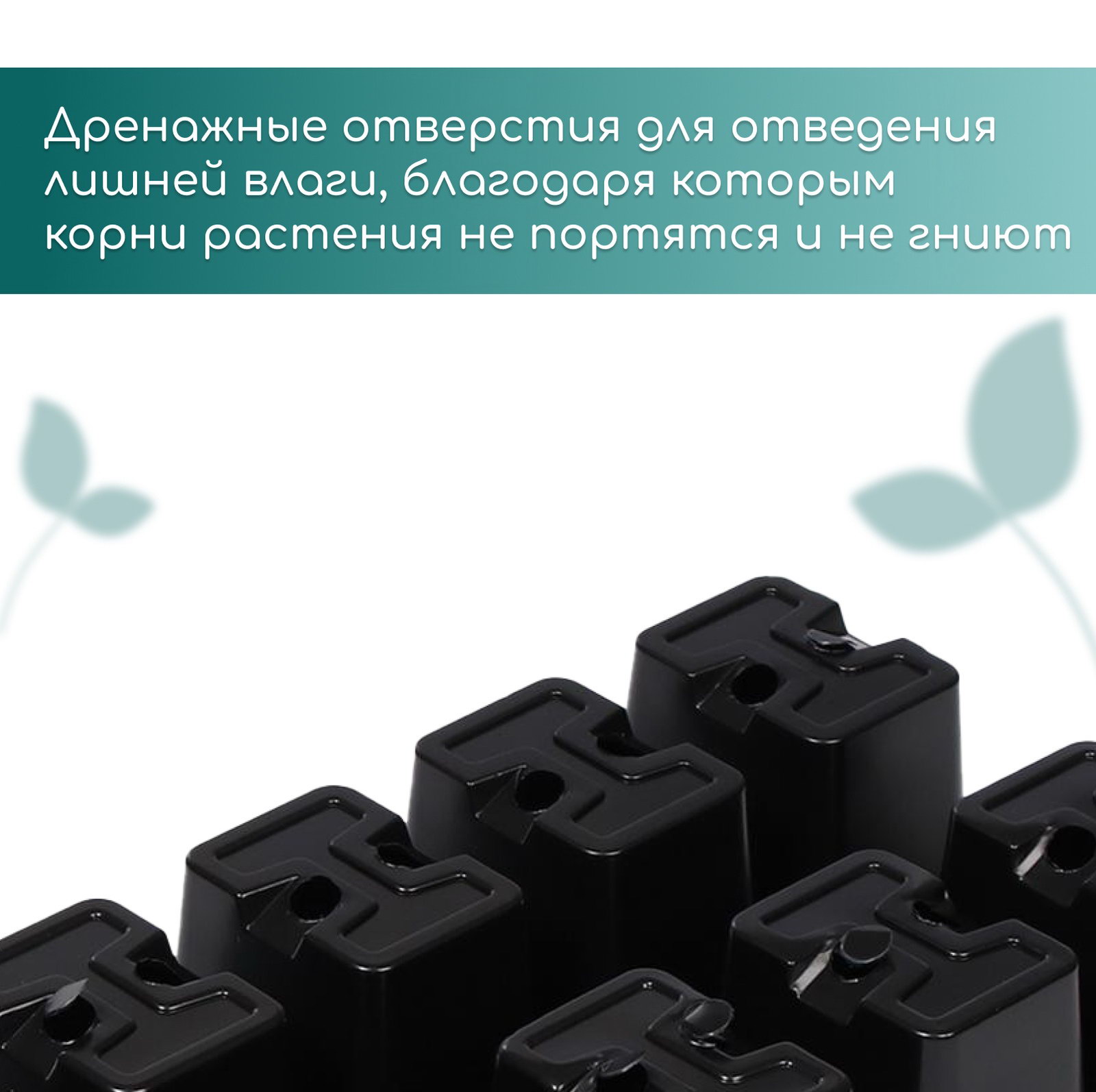 Размер упаковки: 14 x 5 x 25 см. tnved: 3926909700 Цвет: Чёрный Способ производства: Формовка Размер ячейки, см: 5 x 5 x 5.6 Количество ячеек: 10 Объём ячейки, мл: 100 При выращивании в общем ящике корни часто переплетаются и получают недостаточно питания и кислорода. В каждой ячейке корневая система развивается свободно. Поддон регулирует увлажнённость почвы. При недостатке полива добавьте в него воду для впитывания. При избыточном орошении сливайте жидкость из поддона. Пластиковая кассета легко моется, сохраняет форму на солнце, не гниёт. Преимущества