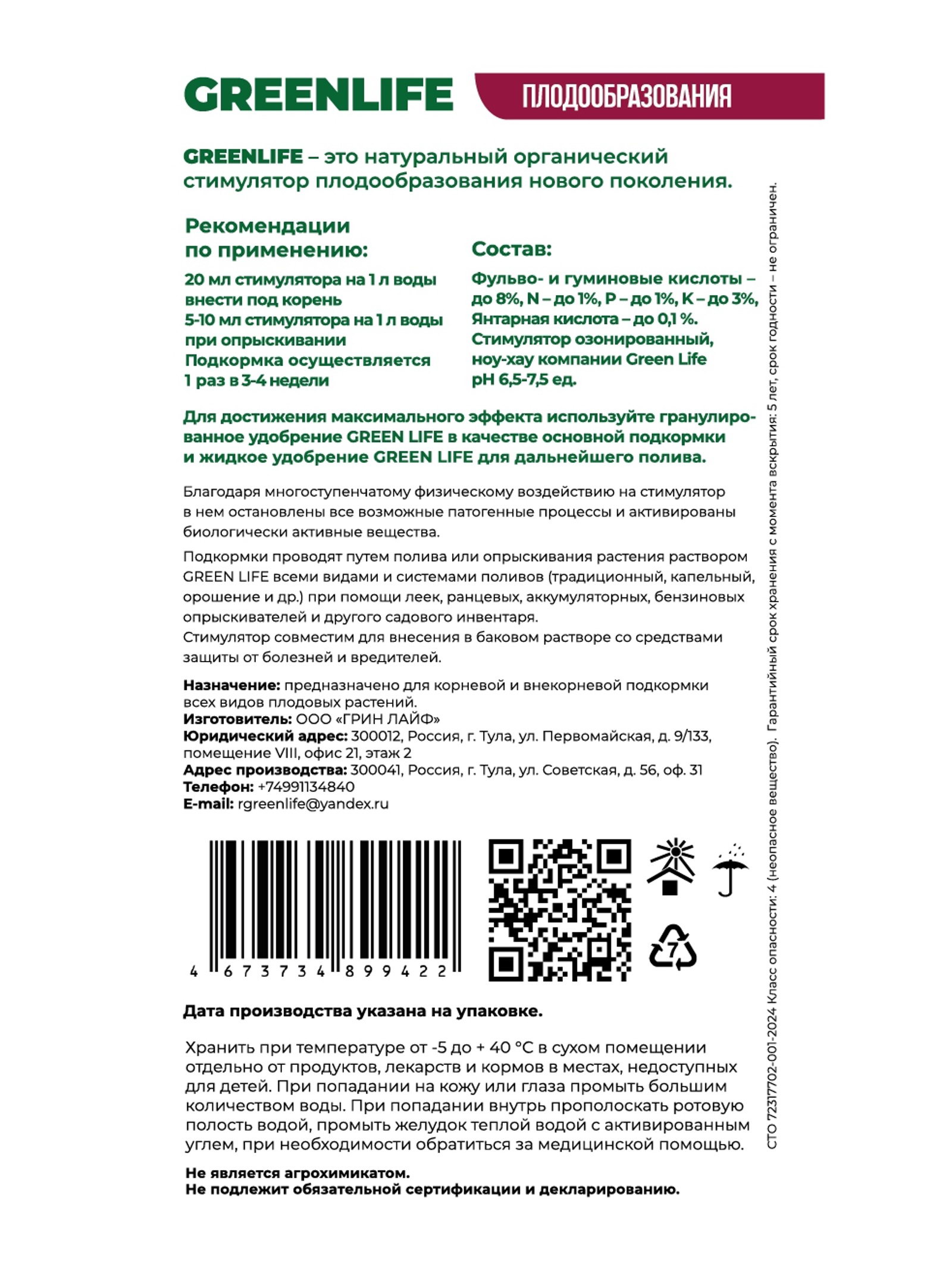 Стимулятор плодообразования саше, 20 мл, Greenlife, Россия