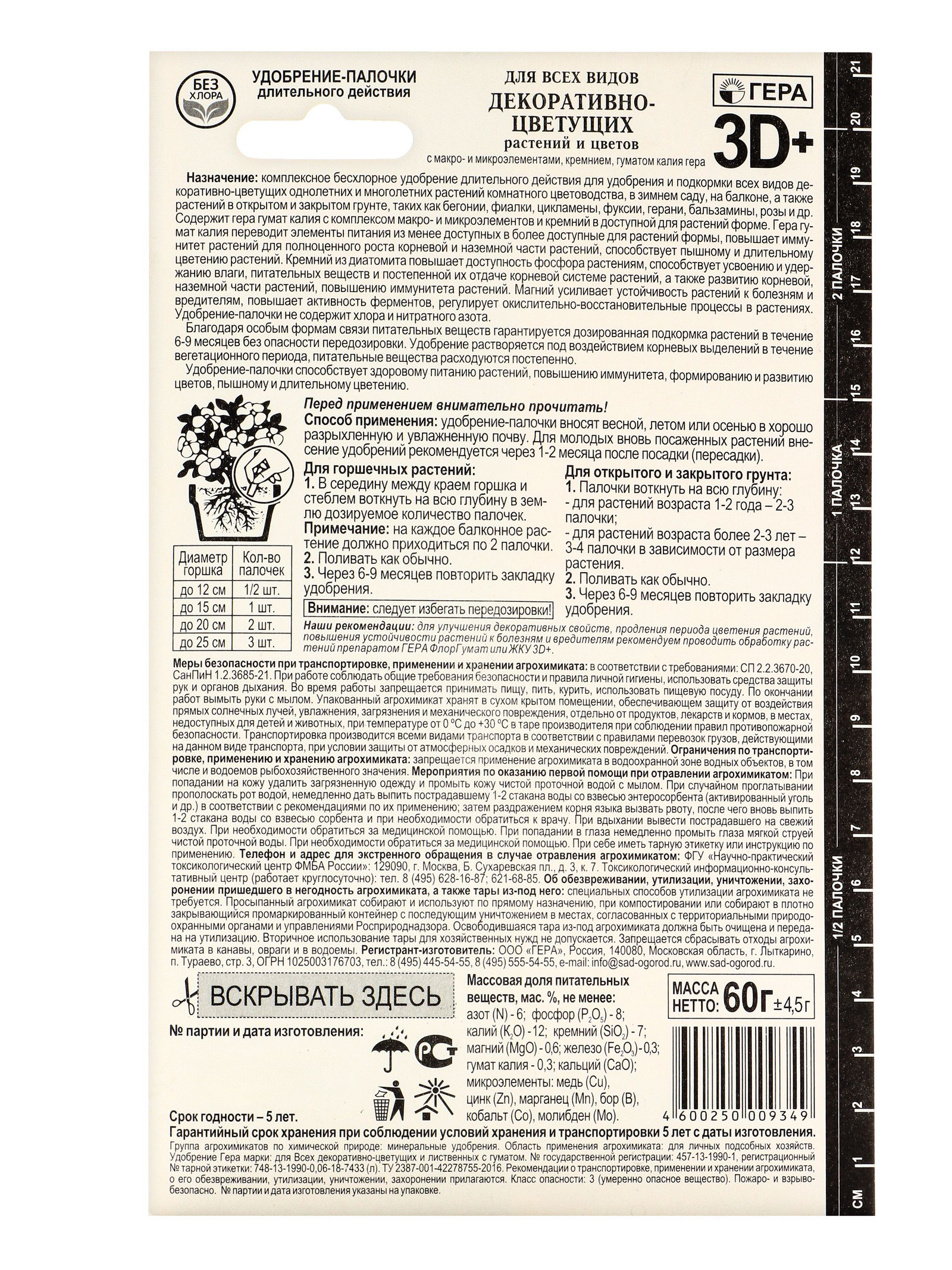 Удобрение "Гера 3D" для декоративно-цветущих, палочки, набор 60 г, ГЕРА, Россия