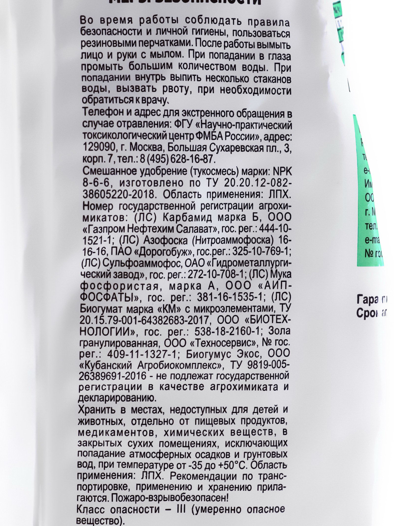 Периоды применения: Весна, Лето, Осень Препаративная форма: Гранулы, Порошок Размер упаковки: 16 x 6 x 18 см. Эффект: Увеличение урожая Вид: Удобрения Группы элементов: Макроудобрения Класс опасности: 3 класс (умеренно опасные) Комплексные удобрения: Нет Комплексные удобрения: Нет tnved: 3105600000 Сатурн: Да Температурное ограничение: Нет Происхождение: Органоминеральные (ОМУ) Область применения: Универсальные ОМУ "Универсал" содержит в своем составе 40% органического вещества, азот, фосфор, калий, магний и микроэлементы, гуминовые соединения. Для обеспечения увеличения продуктивности культуры и восстановления плодородия почвы, органоминеральное удобрение ОМУ "Универсал" модифицировано микробиологическим препаратом на основе ризосферных бактерий. Удобрение предназначено для полноценного питания полевых, садовых, огородных и декоративных культур, а также для выращивания рассады. Применение удобрения обеспечивает высокий урожай с отличными вкусовыми качествами, отсутствие в плодах нитратного азота, морозоустойчивость и сопротивляемость растений болезням. Улучшает структуру почвы - рыхлость и водопроницаемость. | ||
