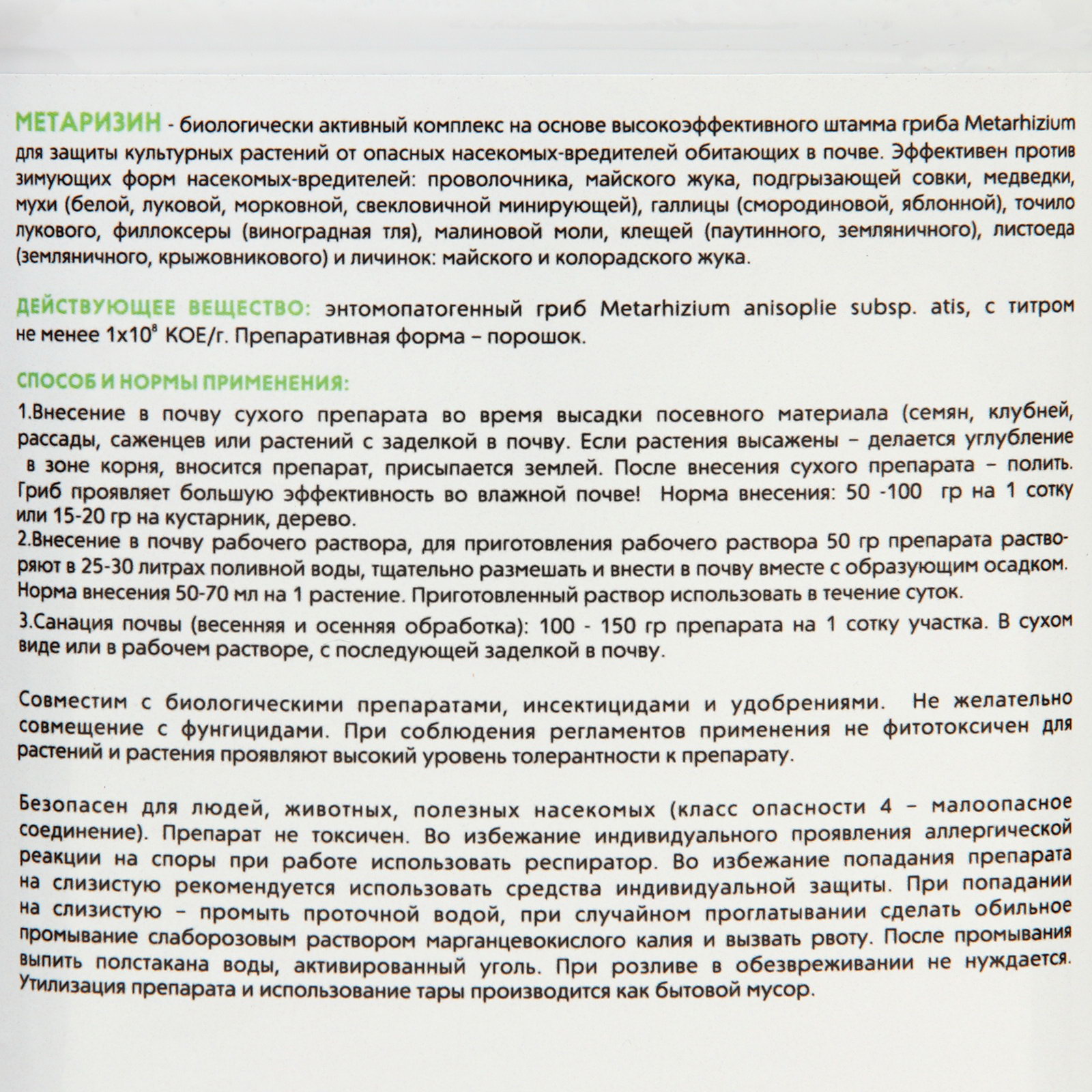 Размер упаковки: 15 x 10 x 22 см. Температурное ограничение: Нет Препаративная форма: Сухая смесь Область применения: Универсальные Комплексные удобрения: Нет Эффект: Увеличение урожая Периоды применения: Круглогодичные Вид: Стимуляторы Класс опасности: 3 класс (умеренно опасные) Группы элементов: Макроудобрения tnved: 3105209000 Вес/Объём: 900 г Метаризин уникальный биологический инсектоакарицид на основе гриба Metarhizium от почвообитающих вредителей (медведки, проволочника, клеща, личинок майского жука и многих других. Действующее вещество: природные штаммы гриба Метаризиум (Metarhizium anisopliae).Способ воздействия: контактно-кишечный.Химический класс: энтомопатогенных грибов.Споры Metarhizium вызывают заболевания и гибель насекомых, тем самым снижают популяцию вредителей:почвообитающих насекомых ( проволочников; медведок; майских жуков (хрущей) и их личинок; подгрызающих совок и др)зимующих или проходящих одну из стадий своего развития в почве или на поверхности почвы: клещей (паутинного, земляничного и др.); листоеда (земляничного, крыжовникового); колорадского жука; долгоносика; огневки; пилильщика; клопа крестоцветного; мухи (морковной, луковой, капустной); крымского и турецкого скосаря; галлицы (смородиновой, яблонной) и множества других насекомых – вредителей).Инструкция по применению:Внесение в почву в сухом виде:50-100г на сотку / 15-20г на кустарник, дерево;Пролив почвы: 50г на 30-50л поливной воды;Санация почвы (весенняя и осенняя обработка): 100-150г на сотку. | ||