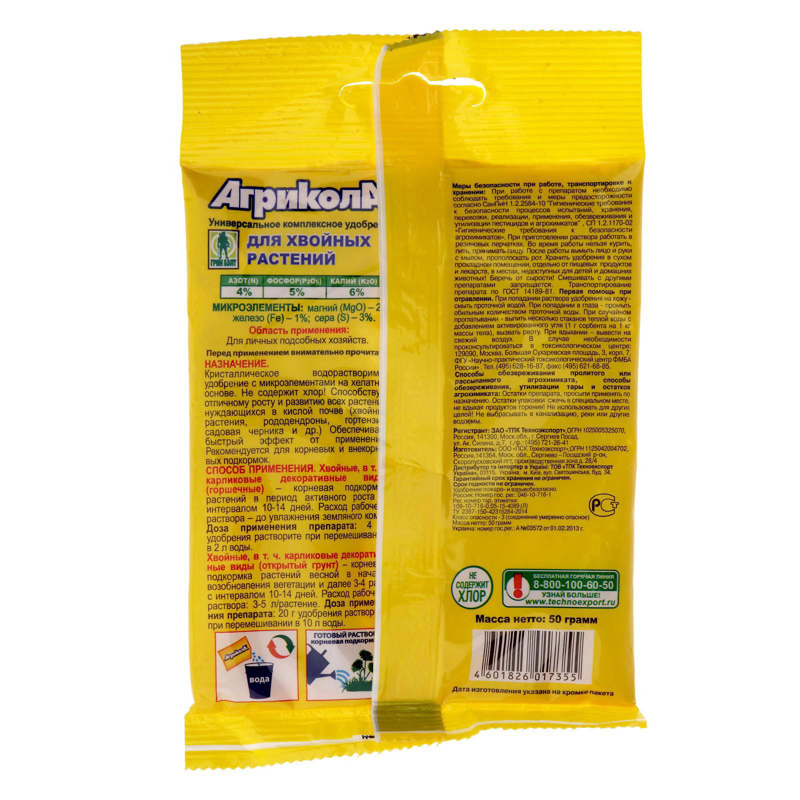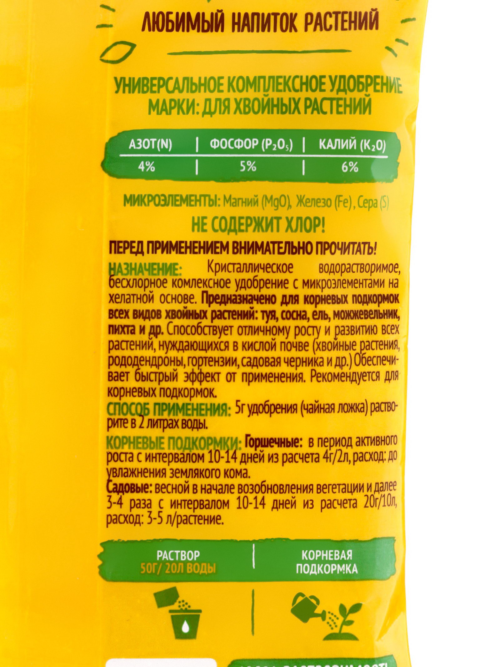 Периоды применения: Весна, Лето, Осень Размер упаковки: 9 x 0.5 x 14 см. Происхождение: Минеральные (неорганические) Вид: Удобрения Эффект: Увеличение урожая Группы элементов: Макроудобрения Класс опасности: 3 класс (умеренно опасные) Комплексные удобрения: Нет Область применения: Универсальные Вес/Объём: 50 г tnved: 3105209000 Сатурн: Сатурн Препаративная форма: Гранулы Удобрение "Агрикола" для хвойных используется для прикорневой подкормки и опрыскивания культур, нуждающихся в кислой почве. Стимулирует рост и развитие саженцев, предотвращает пожелтение хвои, дает быстрый результат. Эффективно для всех хвойных, садовой черники, рододендронов, гортензий и др. Содержит микроэлементы в хелатной форме. Удебрение не содержит хлор. Способствует отличному росту и развитию растений, нуждающихся в кислой почке. Обеспечивает быстрый эффект от применения. Рекомендуется для корневых и внекорневых подкормок. | ||