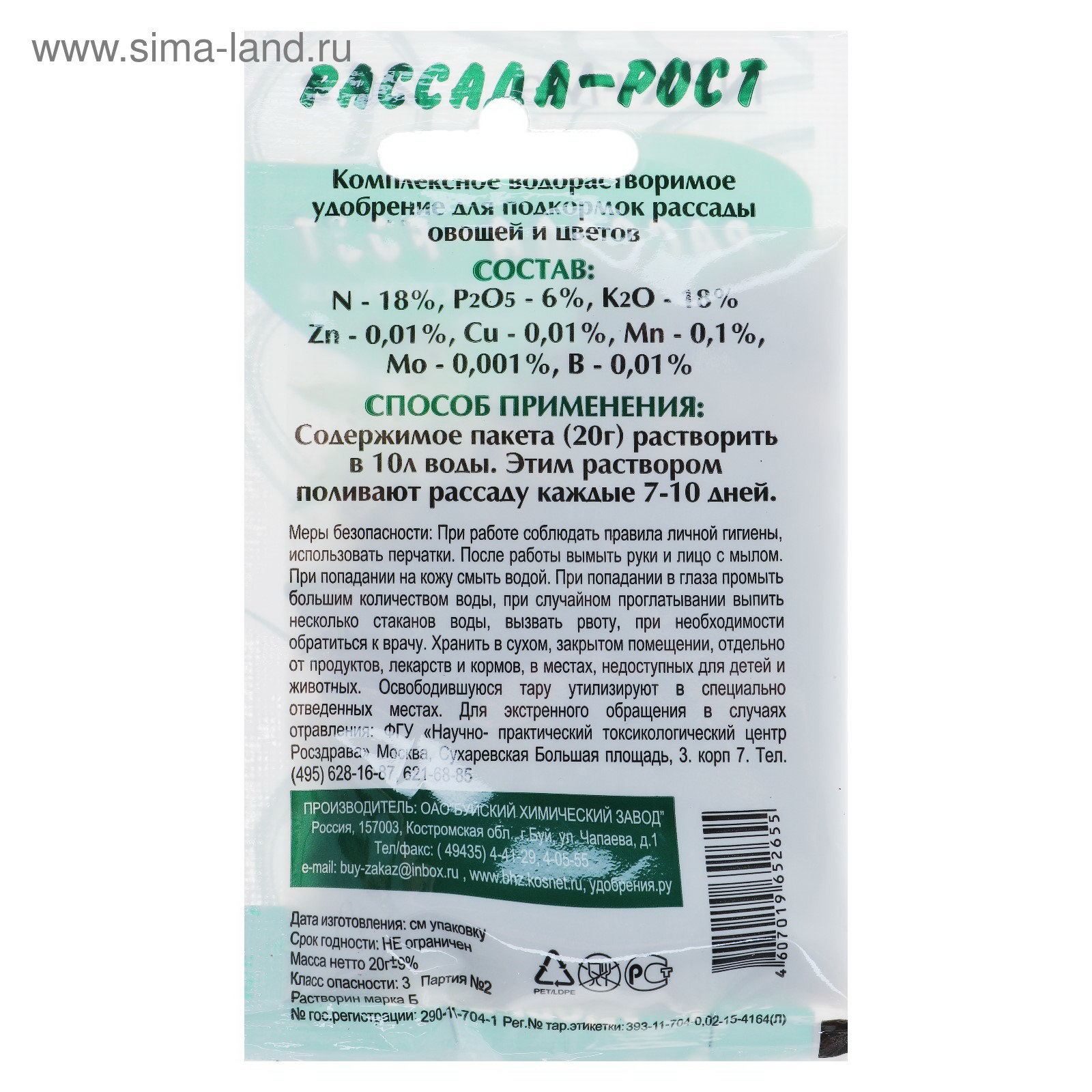 Удобрение водорастворимое бесхлорное минеральное "Рассада-рост", 20 г, Буйские удобрения, Россия