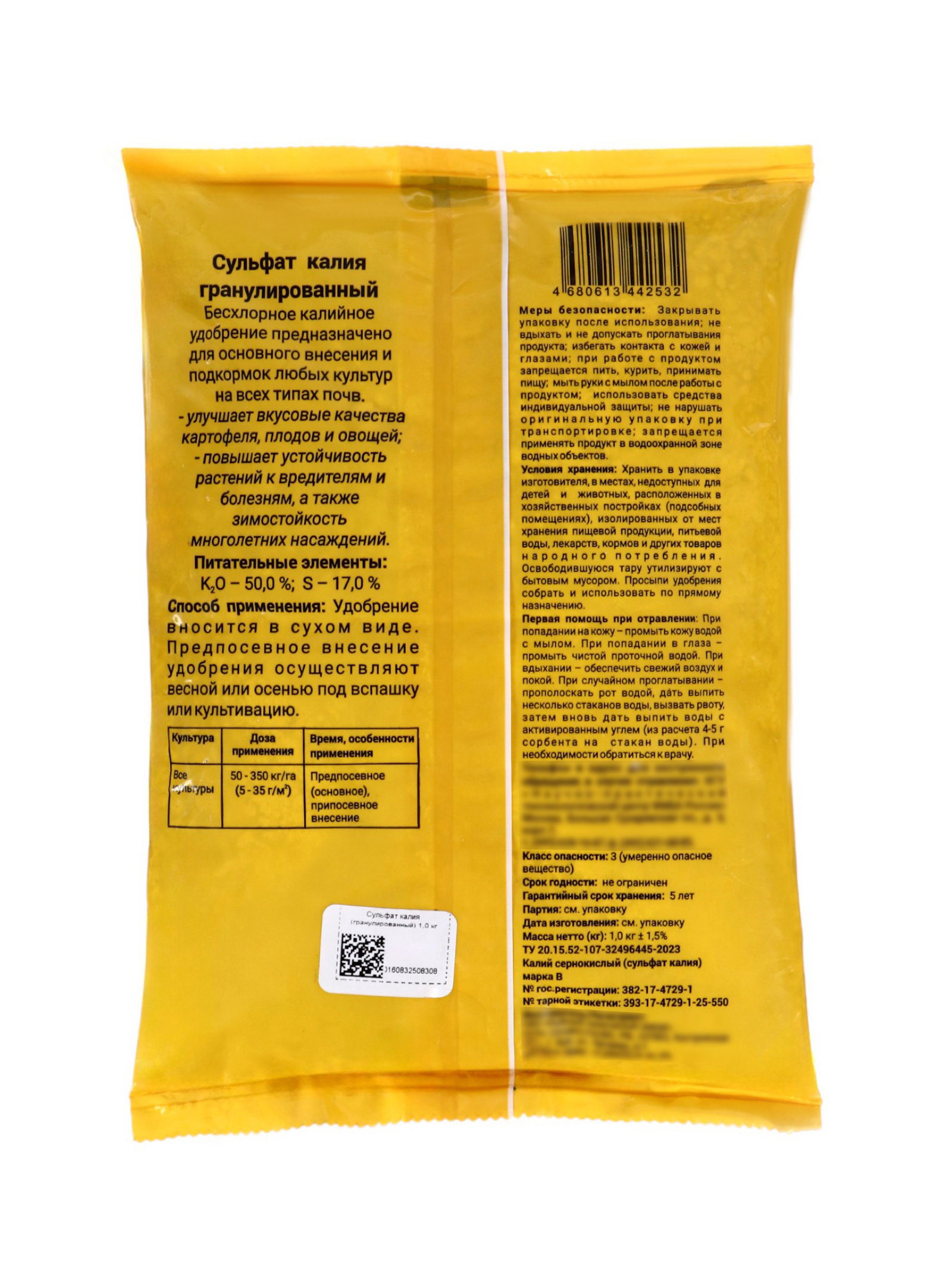 Размер упаковки: 15 x 4 x 20 см. Происхождение: Минеральные (неорганические) Вид: Удобрения Класс опасности: 3 класс (умеренно опасные) Эффект: Увеличение урожая Группы элементов: Макроудобрения Комплексные удобрения: Нет Вид средства: Удобрение Область применения: Универсальные Периоды применения: Осень tnved: 3105209000 Сатурн: Сатурн Препаративная форма: Гранулы "Сульфат калия" это традиционное минеральное удобрение универсального назначения для основного внесения и подкормок любых культур. Содержание калия в составе 53 %. Растворимость 100 %. Средство представляет собой белый кристаллический порошок. Период применения: с апреля по сентябрь. | ||