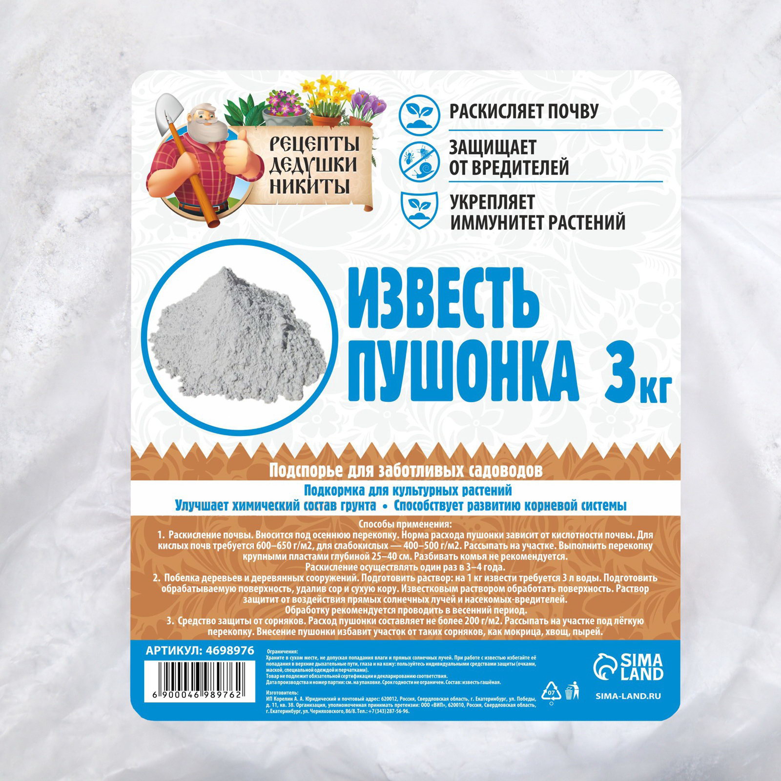 Известь пушонка "Рецепты Дедушки Никиты" 3 кг, Рецепты дедушки Никиты, Россия