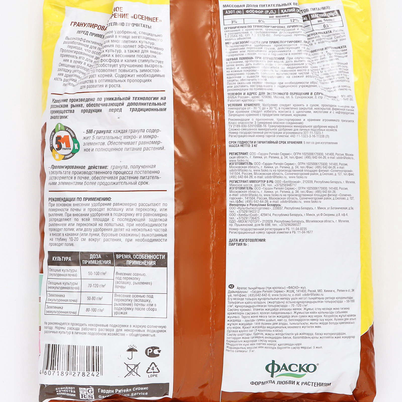 Удобрение сухое минеральное "Осень" 5М, гранулированное, 3 кг, Фаско, Россия