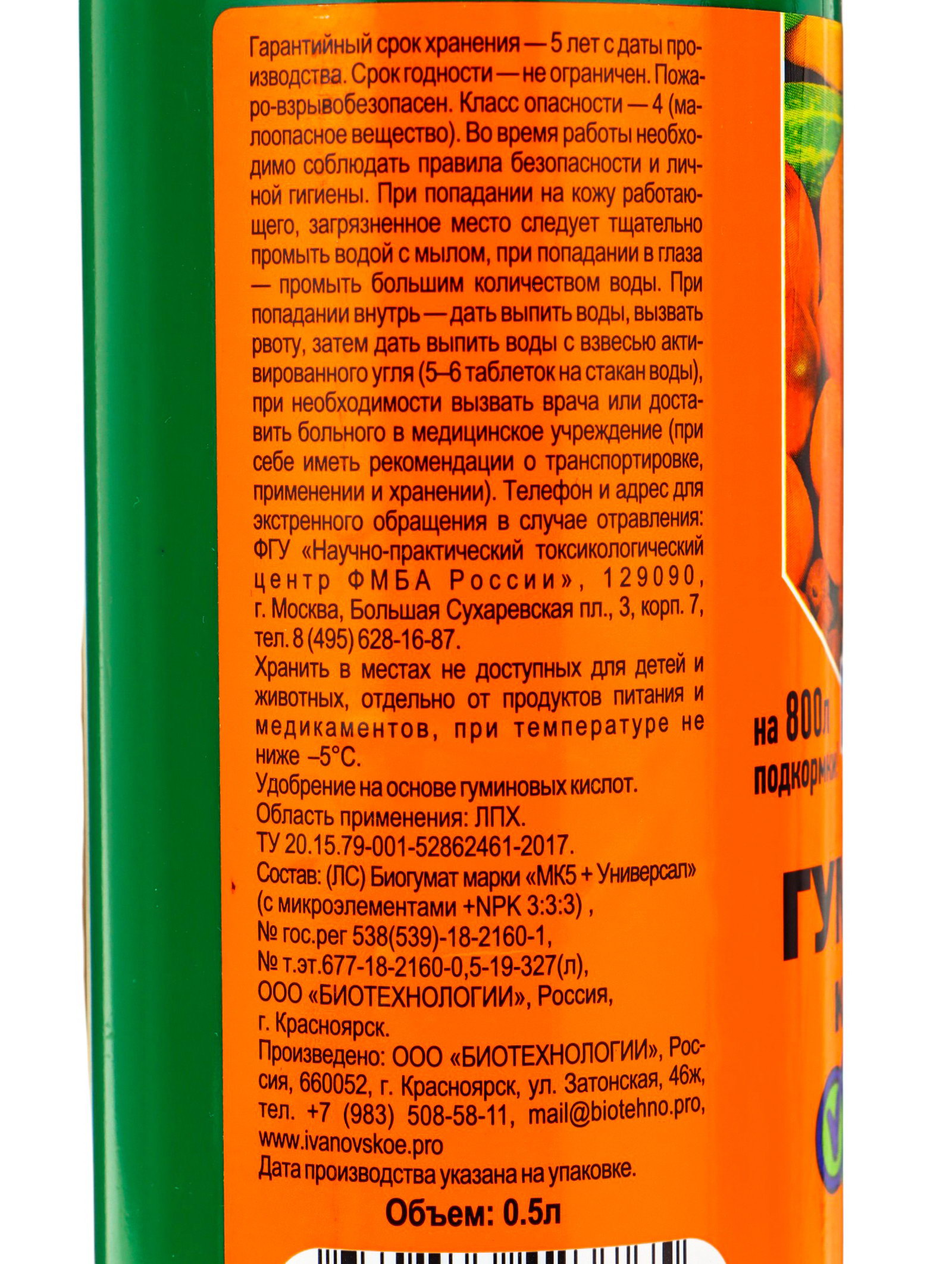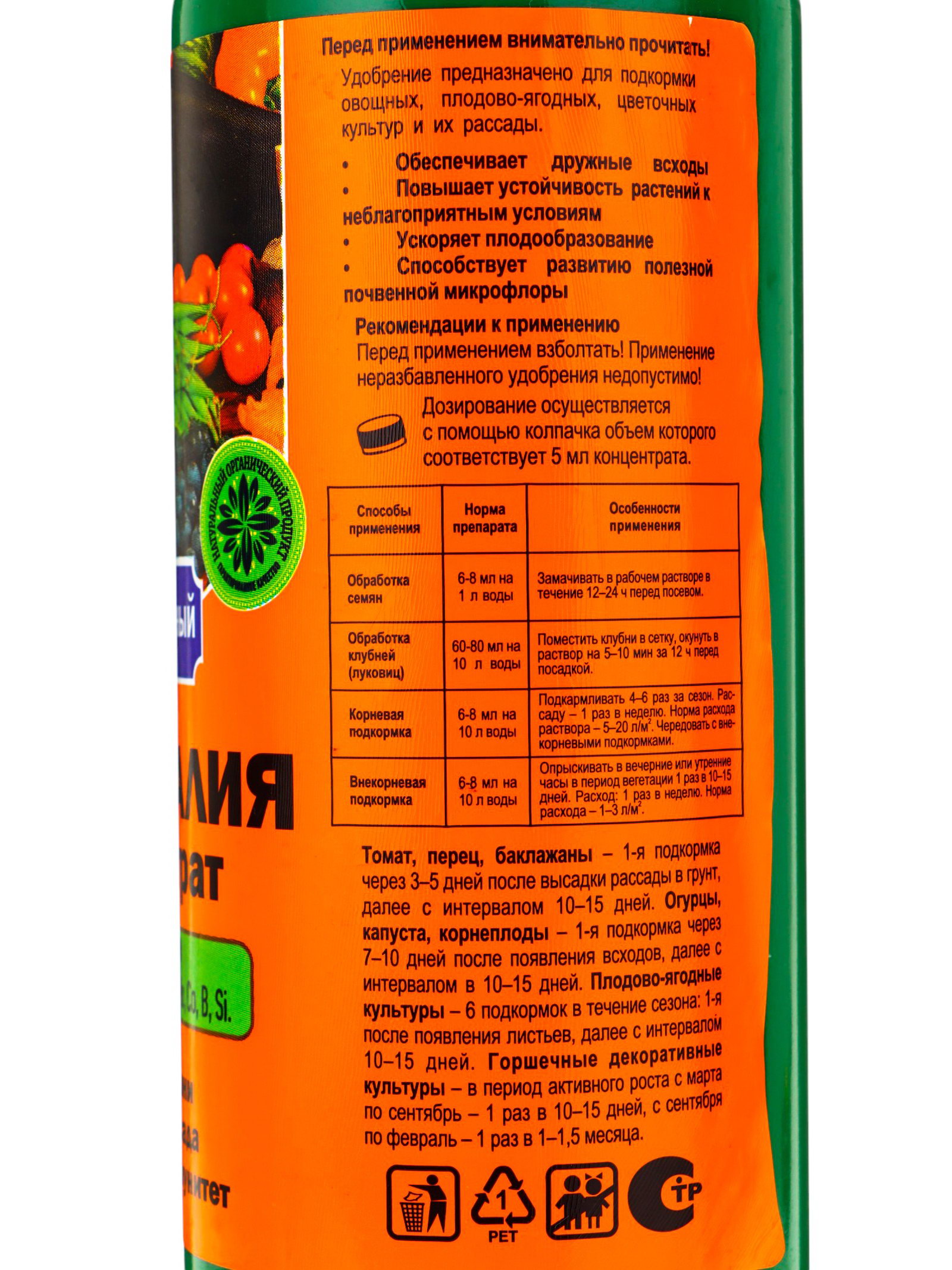 Размер упаковки: 6.5 x 20.5 x 6.5 см. Вид средства: Удобрение Комплексные удобрения: Нет Вид: Удобрения Периоды применения: Круглогодичные Класс опасности: 3 класс (умеренно опасные) Эффект: Увеличение урожая Группы элементов: Макроудобрения Вес/Объём: 500 г Происхождение: Органические (природное) tnved: 3105209000 tnved: 3105209000 Сатурн: Да Сатурн: Да Препаративная форма: Жидкость Область применения: Универсальные Высококонцентрированная органическая подкормка предназначена для овощных, плодово-ягодных и цветочных культур в период вегетации. Обеспечивает дружные всходы и быстрое прорастание семенного материала, стимулирует развитие корневой и стеблевой систем, ускоряет плодообразование. Повышает устойчивость растения к опасным заболеваниям и неблагоприятным условиям внешней среды. Насыщенное микроэлементами средство быстро восстанавливает плодородность земли, развивает почвенную микрофлору. Безопасно для человека, животных, пчёл и окружающей среды. Из 0,5 концентрата выходит 800 л подкормки. Состав: массовая доля солей гуминовых кислот 6 %. Микроэлементы в составе: железо, медь, кальций, магний, молибден, кобальт, бром, кремний. Применение Подкормка