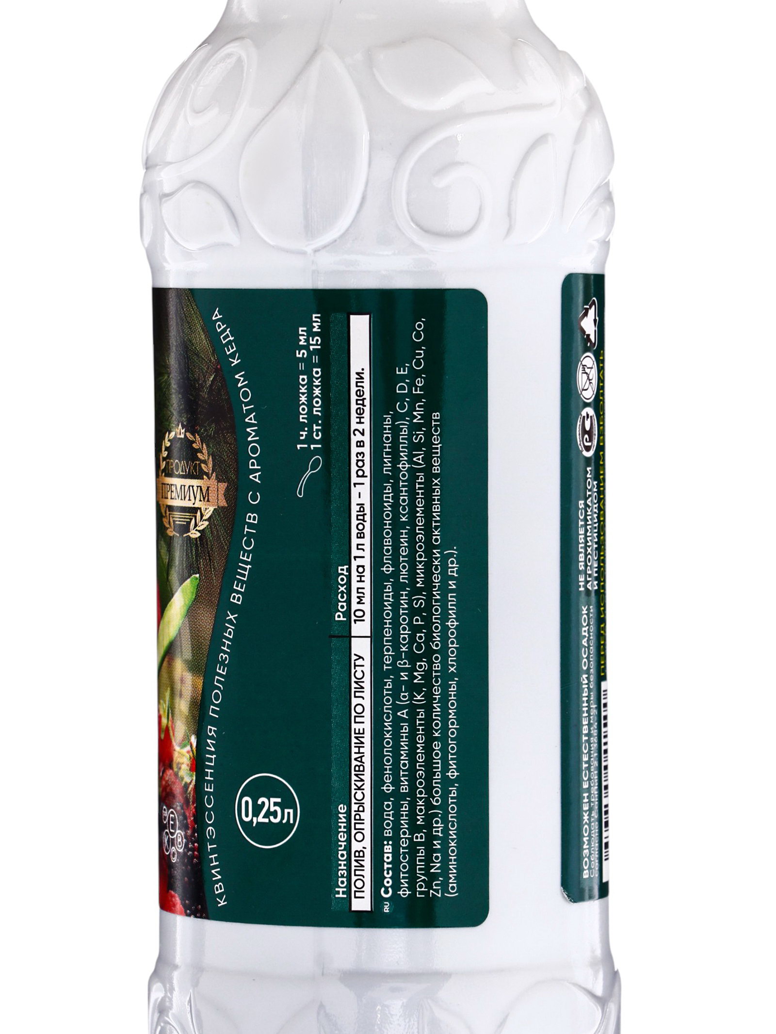 Размер упаковки: 7 x 4 x 17 см. Происхождение: Минеральные (неорганические) Периоды применения: Круглогодичные Группы элементов: Макроудобрения Вид: Удобрения Эффект: Увеличение урожая Класс опасности: 3 класс (умеренно опасные) Комплексные удобрения: Нет Запрет реализации по сегментам: 00000000594 Вес/Объём: 250 мл Вес/Объём: 250 мл tnved: 3105209000 tnved: 3105209000 Вид средства: Удобрение Препаративная форма: Жидкость Область применения: Универсальные Экстракт кедра сибирского с богатым составом биологически активных веществ. Значительно улучшает выработку фитогормонов, рост, урожайность, стрессоустойчивость, защищает от заболеваний. Состав: Фенолокислоты, терпеноиды, флавоноиды, лигнаны, фитостерины, витамины A C D E, группы В, макроэлименты K, Mg, Ca, P, S, микроэлименты Al, Si, Mn, Fe, Cu, Co, Zn и др. | ||