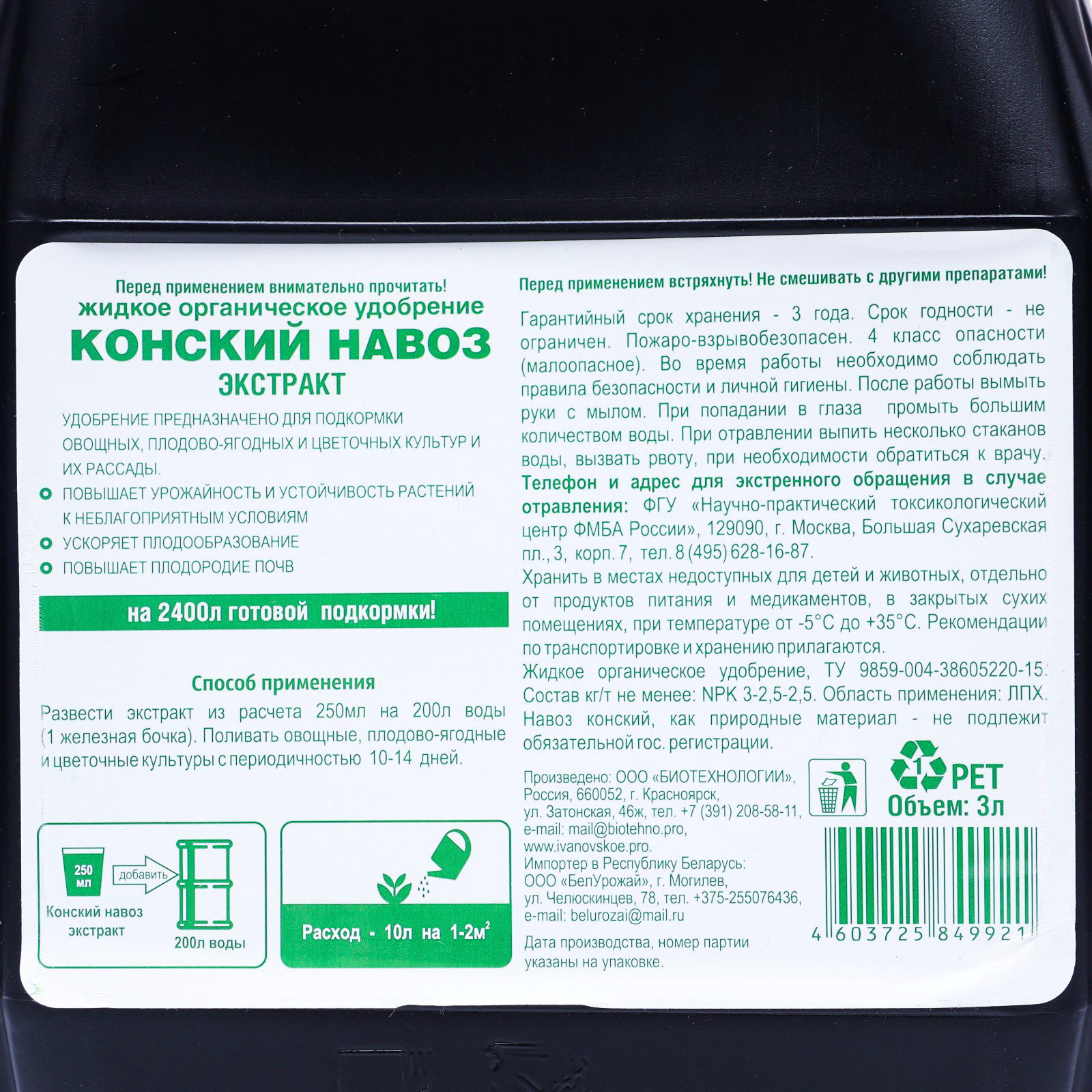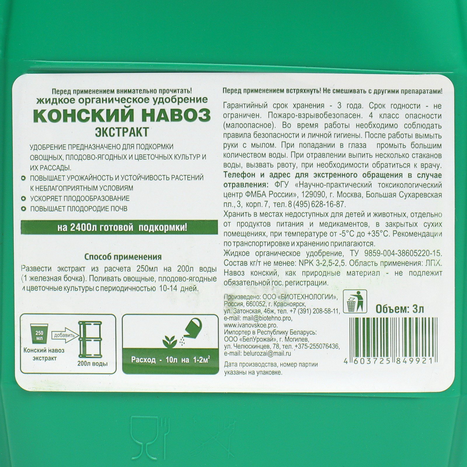 Область применения: Для клубники, Для овощей, Для садовых цветов, Для фруктово-ягодных деревьев и кустарников Периоды применения: Весна, Лето, Осень Эффект: Увеличение урожая, Увеличение цветения, Улучшение плодородия почвы Размер упаковки: 13 x 20 x 15.5 см. Вид: Удобрения Группы элементов: Макроудобрения Класс опасности: 3 класс (умеренно опасные) Комплексные удобрения: Нет Вес/Объём: 3 л Происхождение: Органические (природное) tnved: 3101000000 tnved: 3101000000 Меркурий: Да Температурное ограничение: Нет Вид средства: Удобрение Темпер. ограничение НЕ НИЖЕ ℃: -5 Препаративная форма: Жидкость Конский навоз экстракт является самым питательным по содержанию минеральных веществ: NPK, микроэлементы (медь, цинк, марганец) в легкоусвояемой форме, природные стимуляторы роста. Для всех видов растений сада и огорода: плодовых деревьев и кустарников, овощей и декоративных растений, цветов, рассады. Повышает урожайность и устойчивость растений к неблагоприятным условиям. Ускоряет плодообразование. Повышает плодородие почв. 3 л на 2400л готовой подкормки! Способ применения: Развести экстракт из расчета 250мл на 200л воды (1 железная бочка). Поливать овощные, плодово-ягодные и цветочные культуры с периодичностью 10-14 дней. Перед применением встряхнуть! Не смешивать с другими препаратами! Гарантийный срок хранения - 3 года. Срок годности - не ограничен. | ||