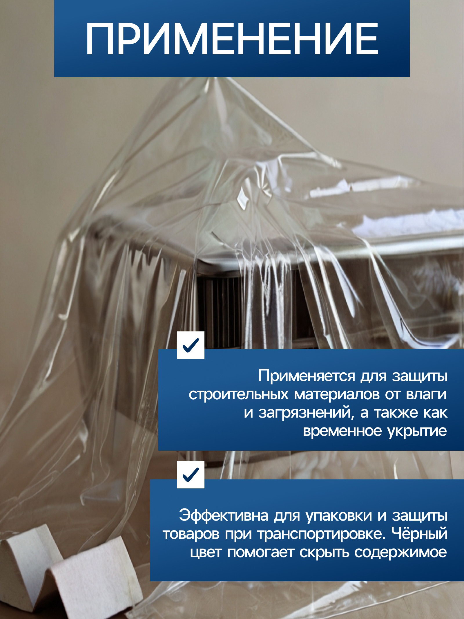 Техническая плёнка применяется для мульчирования (защиты посадок от сорняков), а также защиты любых предметов от осадков. Она выпускается в виде рукава, который при необходимости можно разрезать. Плёнка производится из вторичного полиэтилена, поэтому она чёрного цвета.. Преимущества