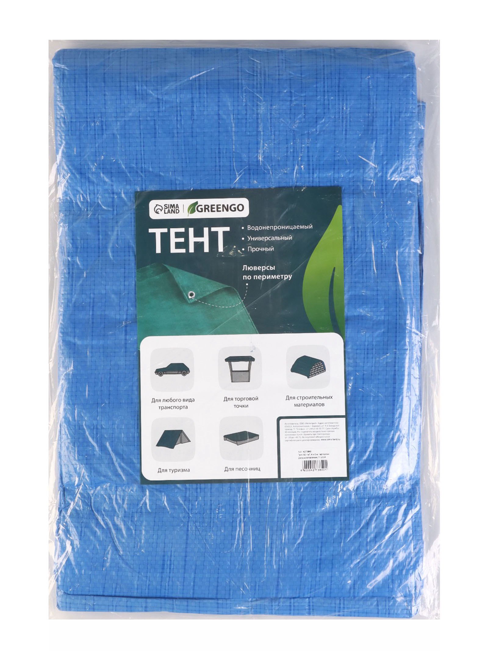 Тент защитный, 6x4 м, плотность 60 г/?2, УФ, люверсы шаг 1 м, голубой, Россия