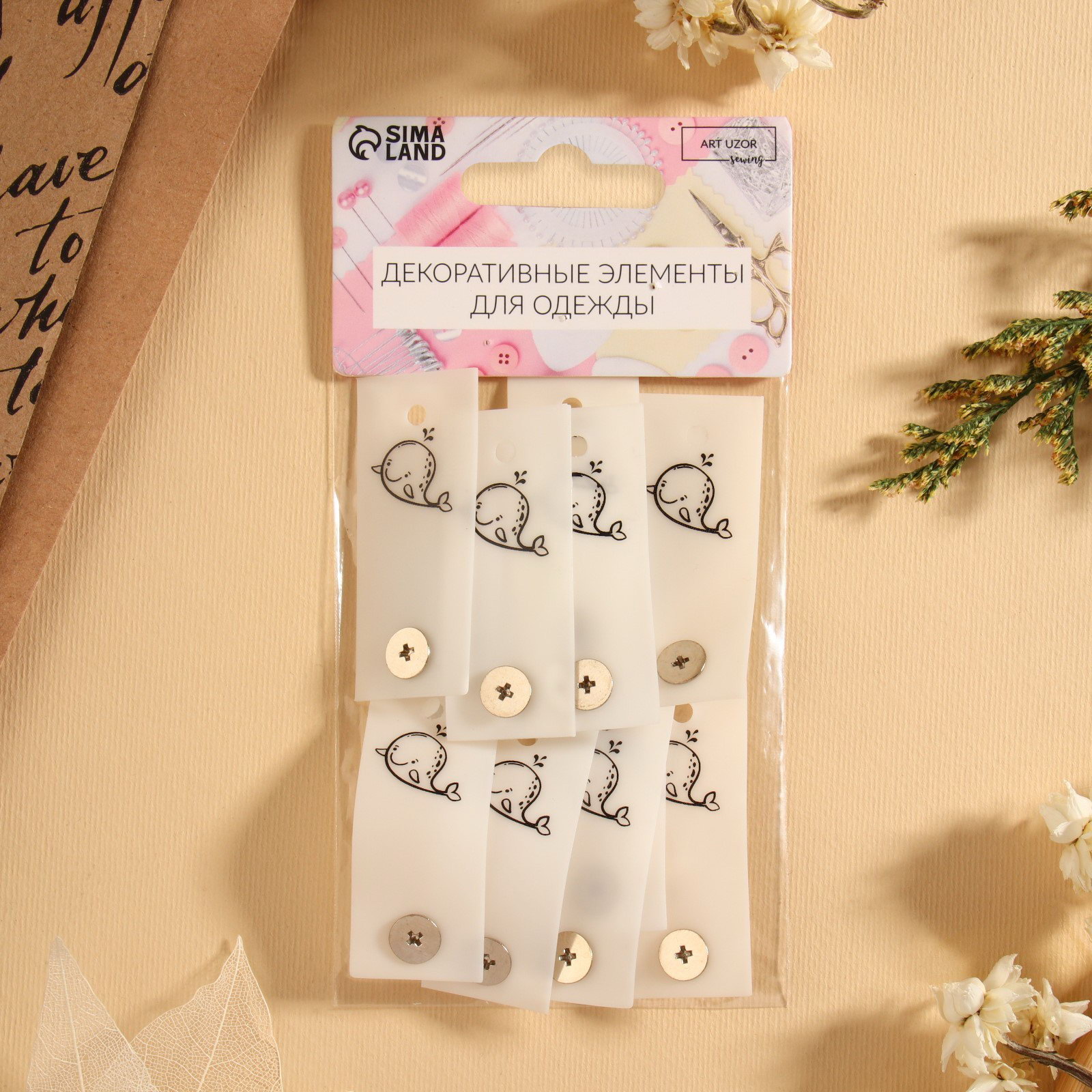 Бирка с кнопкой "Кит", 5 x 2 см, 10 шт, цвет белый/чёрный, 7x10x1 см., Арт Узор, Китай